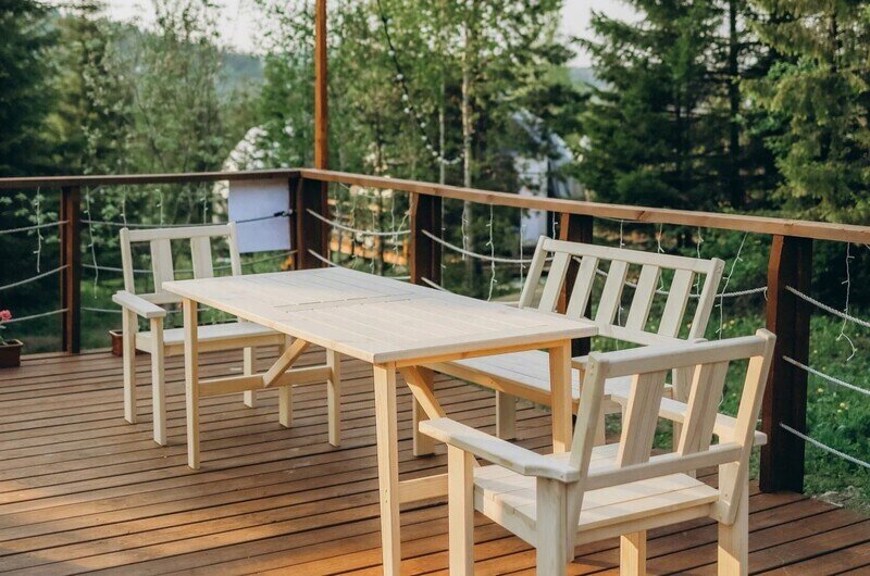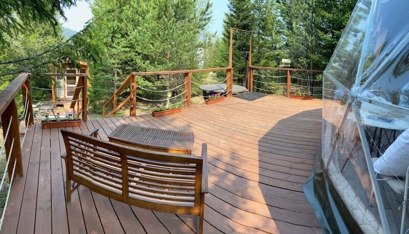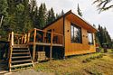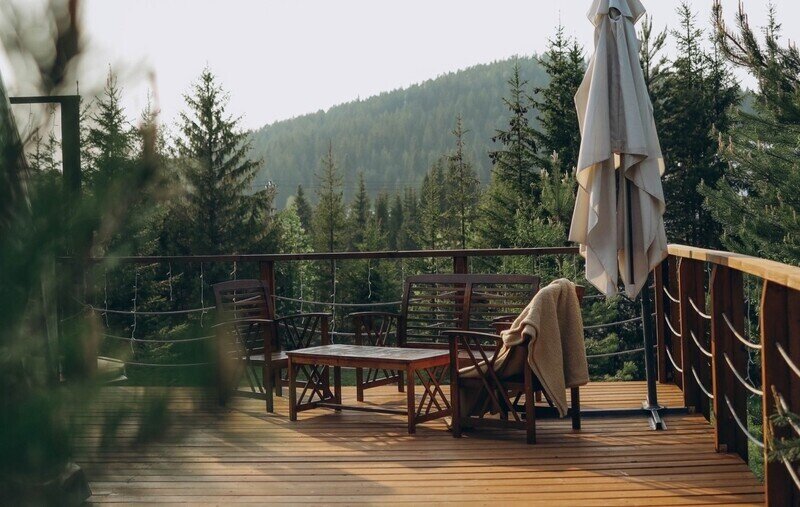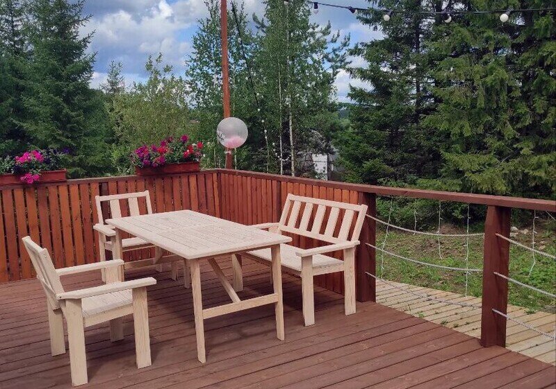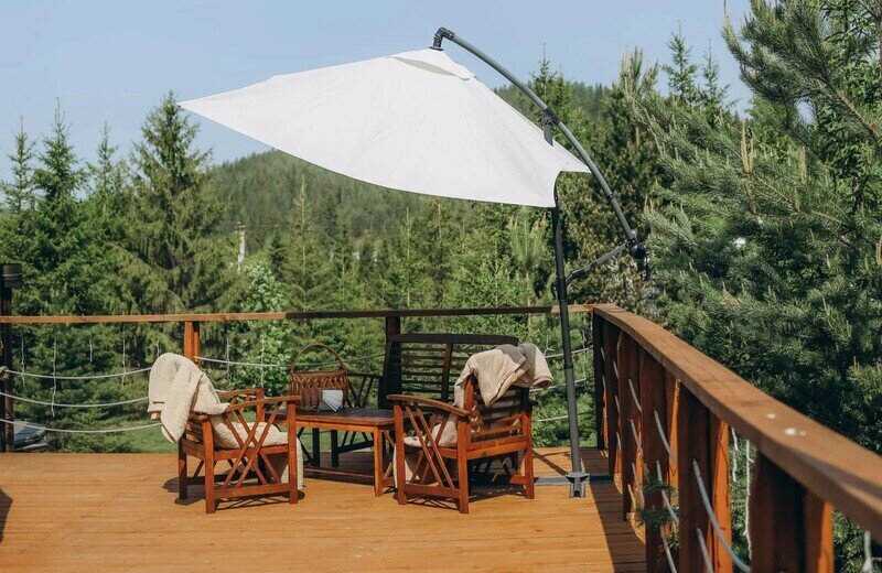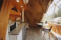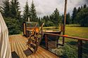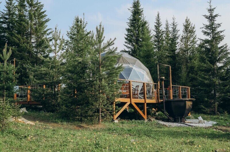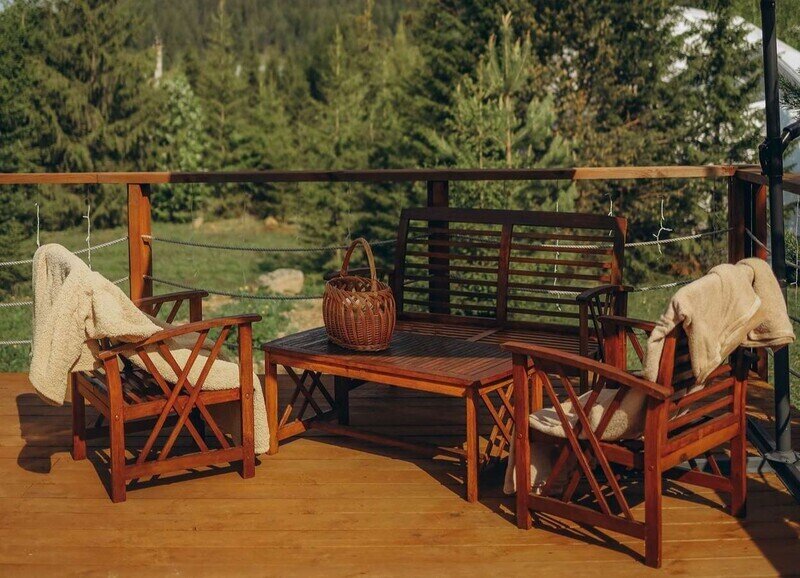 Шатер в окружении леса, с собственным чаном и баней на террасе.
