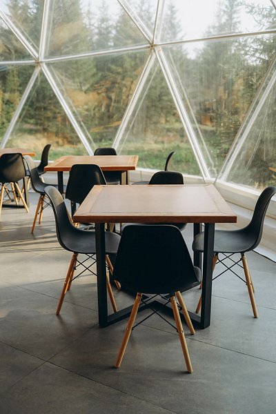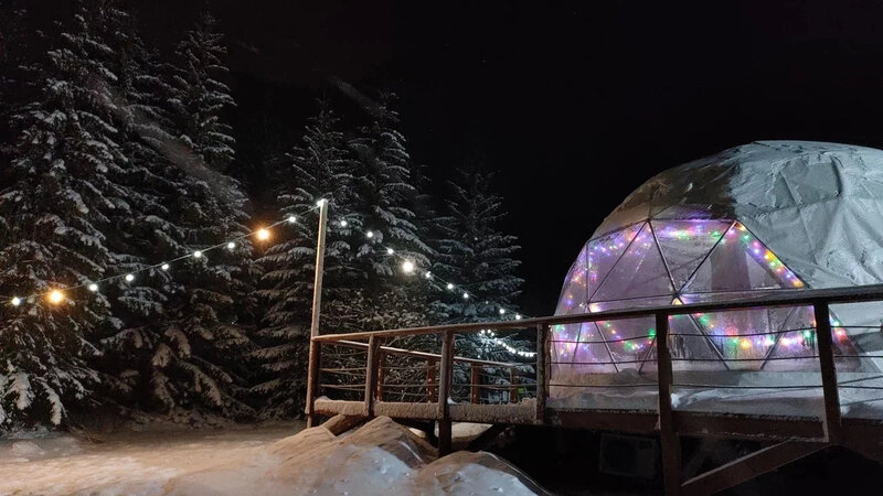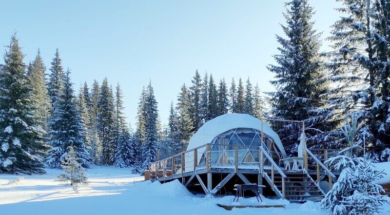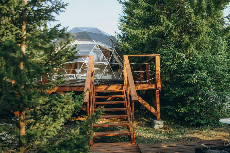 Большой купольный шатер (до 30 гостей) расположен в живописной локации с видом на лес.