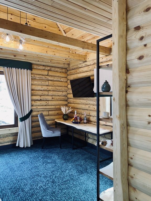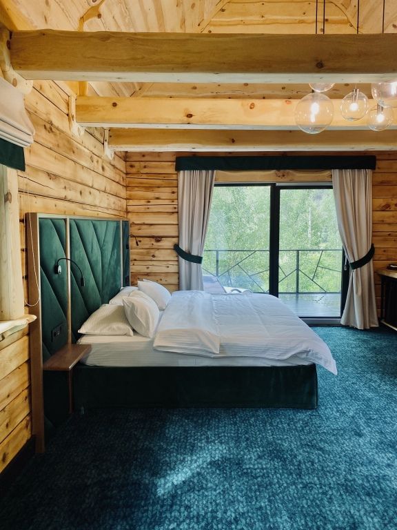 Уютная двухэтажная вилла из массива натурального дерева с террасой и живописным видом на горы и парк маралов. Дизайн интерьера выполнен в классическом стиле русской избы с современными элементами декора. Дом оснащен всем необходимым для комфортного проживания семьи или компании друзей: две спальни с одной двуспальной и двумя односпальными кроватями с ортопедическими матрасами, мягким белоснежным бельем, кондиционером, Smart TV, блэкаут шторами, чайно-кофейной зоной и функциональной ванной комнатой. Всем гостям предоставляется услуга персонального батлера, который будет на связи в круглосуточном режиме и выполнит любые просьбы.