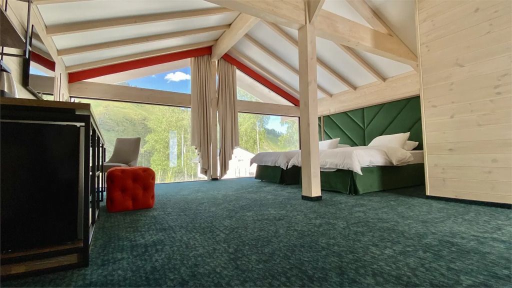 Комфортные кровати, ТВ, письменный стол. Все удобства в номере. Панорамные окна позволят наблюдать за величием гор в любое время суток Вашего отдыха.