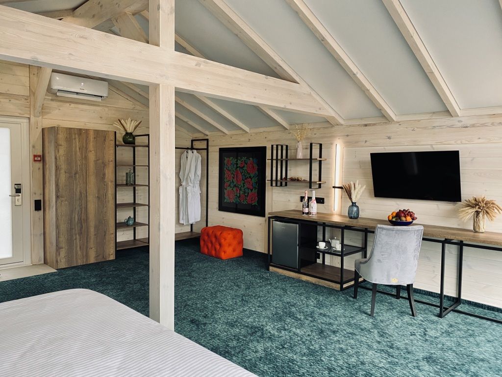 В номере располагается большая двуспальная кровать, ТВ, письменный стол. Все удобства в номере. Панорамные окна позволят наблюдать за величием гор в любое время суток Вашего отдыха.