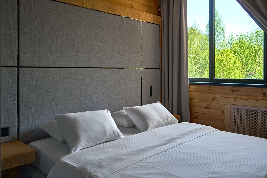 Просторное и стильное шале на первой линии с панорамными окнами подарит живописный вид на парк маралов и горы Алтая. В шале есть все для качественного отдыха и комфортного сна: одна двуспальная кровать с ортопедическим матрасом, невесомое одеяло, климат-контроль, Smart TV, блэкаут шторы, приглушенный теплый свет, чайная зона и современная ванная комната. Натуральные материалы в интерьере создают уютную и теплую атмосферу, а панорамные окна позволяют наблюдать за величественными маралами в любое время суток, погружаясь в единение с природой. Всем гостям предоставляется услуга персонального батлера, который будет на связи в круглосуточном режиме и выполнит любые просьбы. Идеально для тех, кто ценит гармонию природы и комфорт.