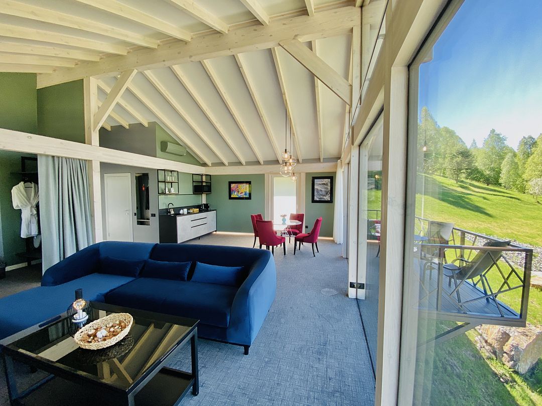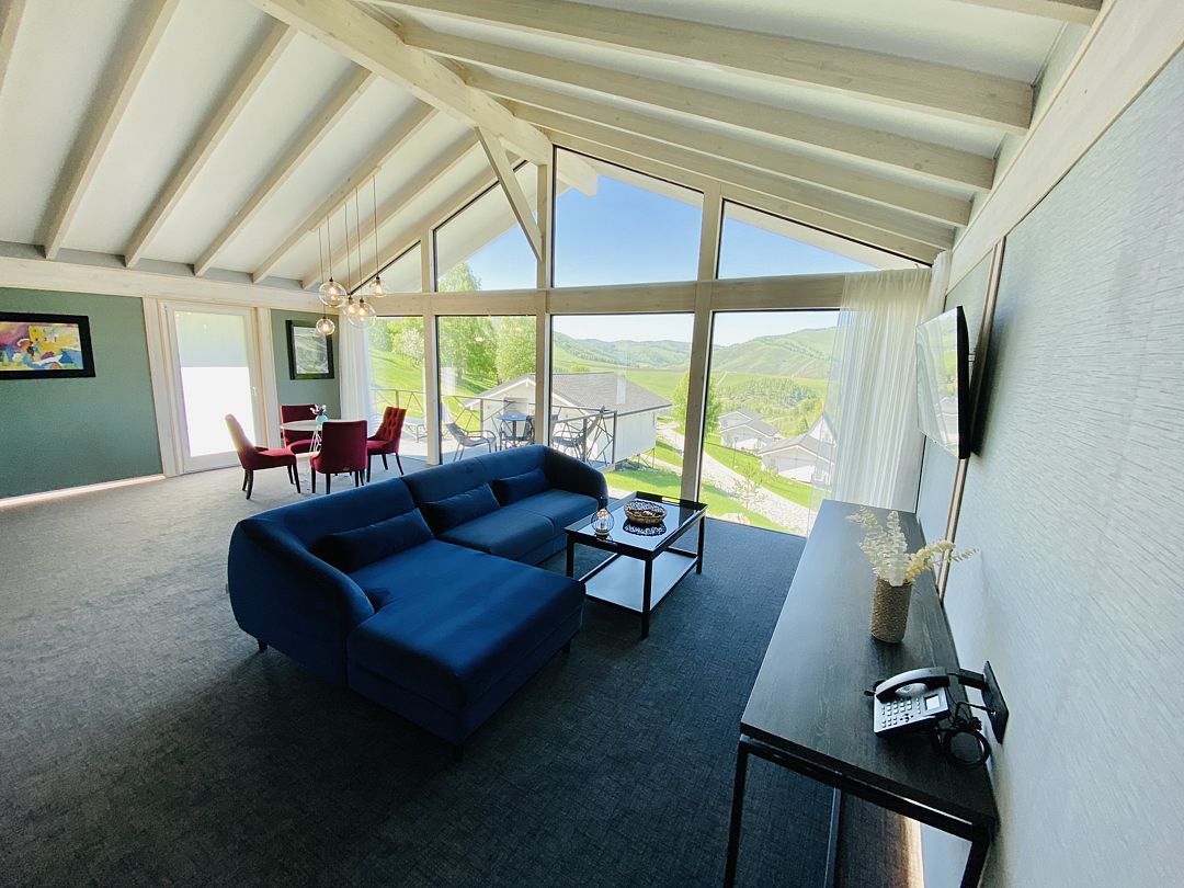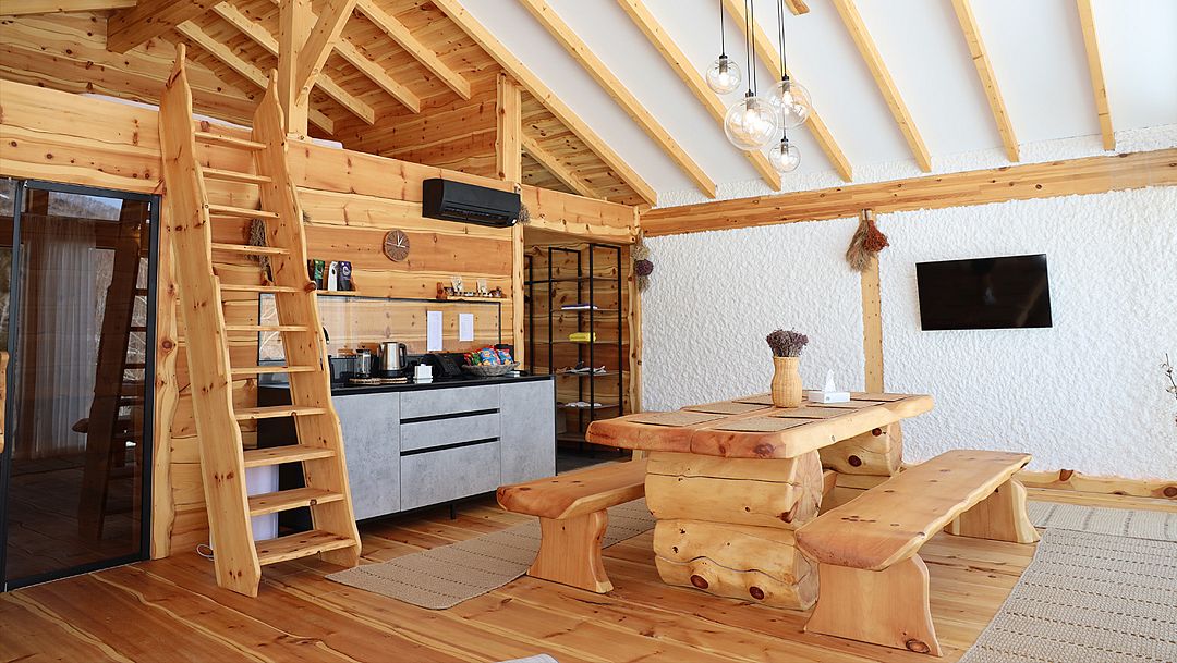 Вилла состоит из одной большой комнаты, которая разделена на спальную зону с большой двуспальной кроватью и гостиную с диваном- софой и ТВ. Также здесь располагается мини-кухня с обеденным столом. Панорамные окна позволят наблюдать за величием гор в любое время суток Вашего отдыха.
