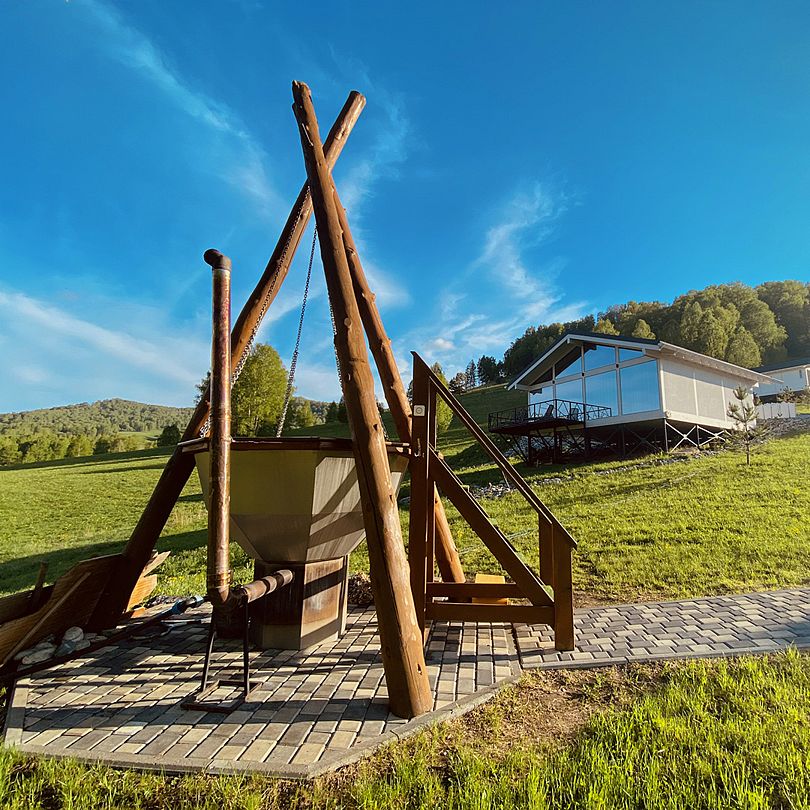 Двухуровневый дом с шикарной винтовой лестницей. На мансардном этаже расположена большая двуспальная кровать, на первом этаже- две полутороспальные, а также диван-софа. Панорамные окна позволят наблюдать за величием гор в любое время суток отдыха.