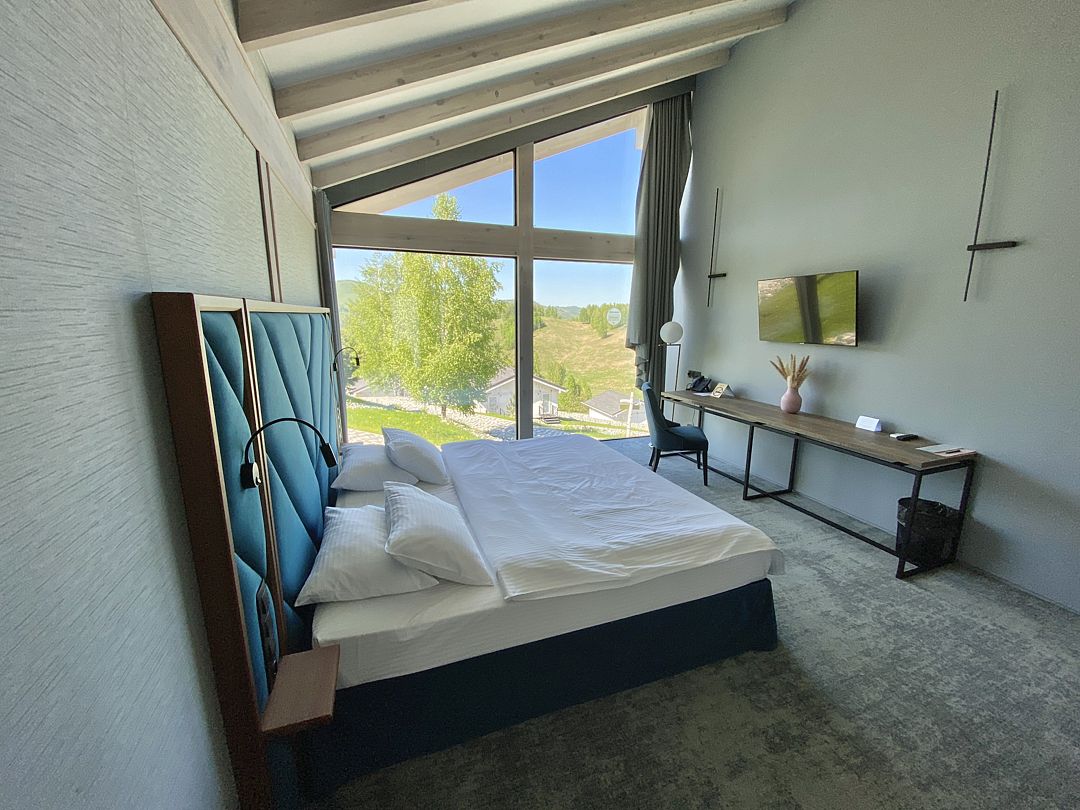 В номере располагается большая двуспальная кровать, ТВ, письменный стол. Все удобства в номере. Панорамные окна позволят наблюдать за величием гор в любое время суток отдыха.