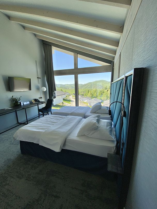 В номере располагаются две полутороспальные кровати, ТВ, письменный стол. Все удобства в номере. Панорамные окна позволят наблюдать за величием гор в любое время суток отдыха.
