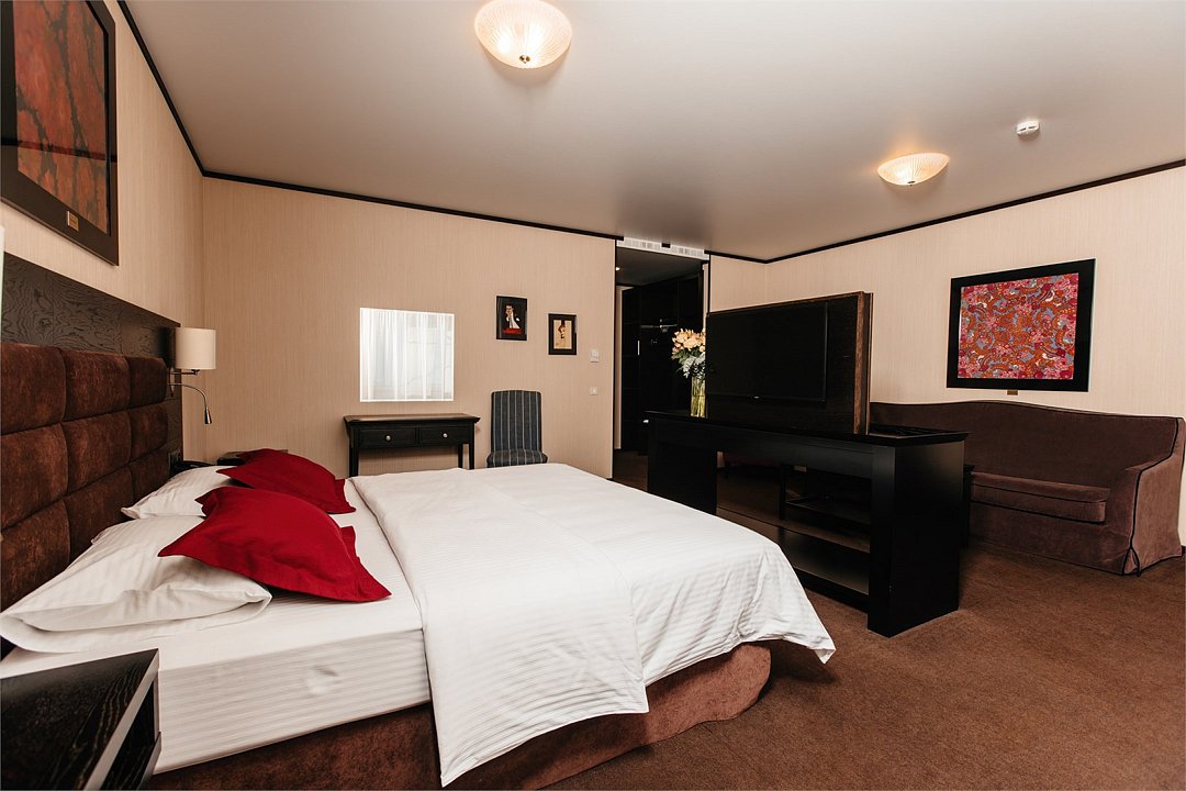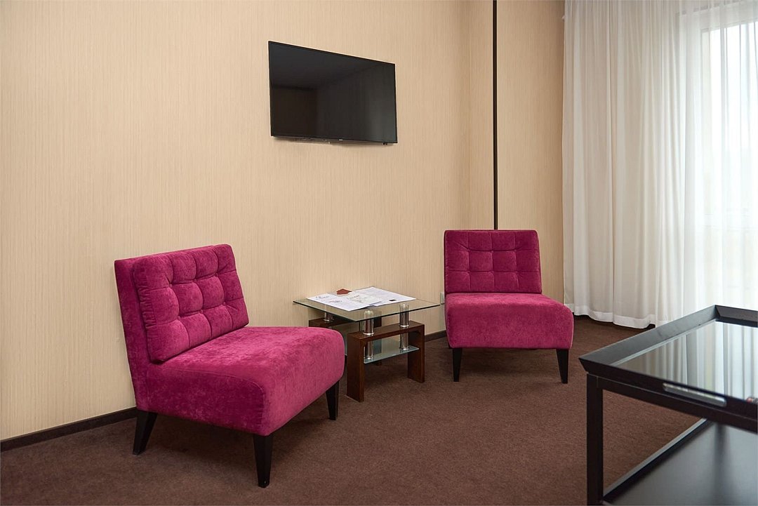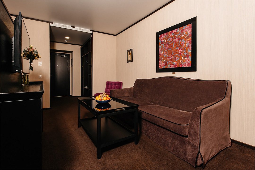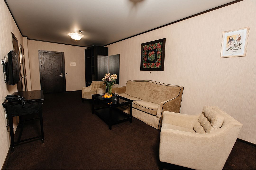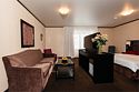 Номер состоит из двух комнат: 1 спальни и гостиной, рассчитан на комфортное размещение до 4 персон. В спальне расположена двуспальная кровать, в гостиной — диван-кровать, кресла и журнальный столик.