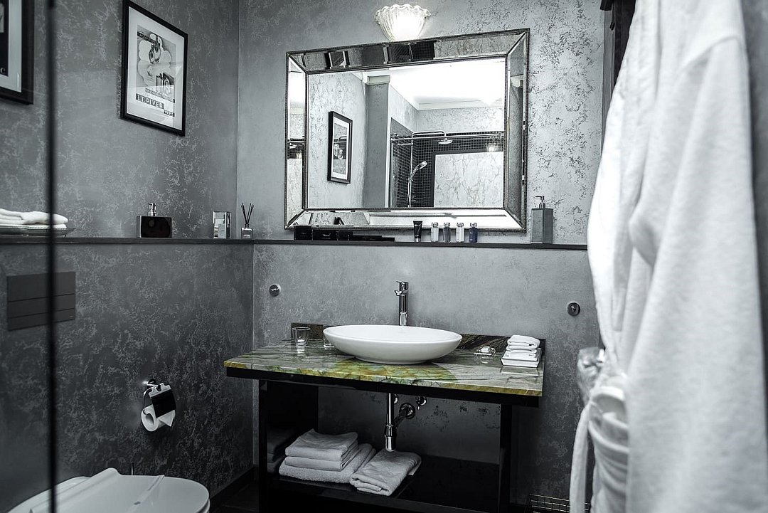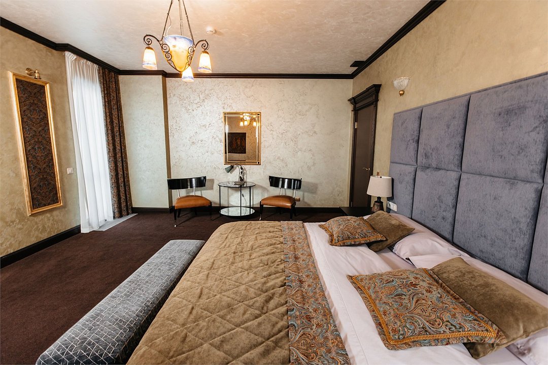 Классический номер для двух персон в главном здании арт-отеля со спальной зоной, большой кроватью и ванной комнатой.