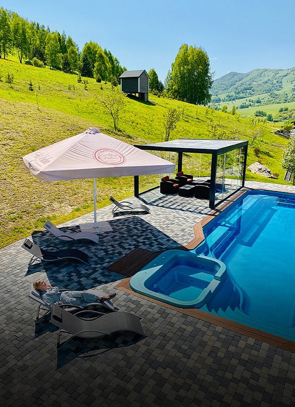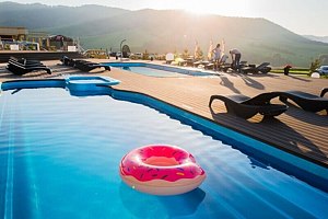 Вилла состоит из одной большой комнаты, которая разделена на спальную зону с большой двуспальной кроватью и гостиную с диваном- софой и ТВ. Также здесь располагается мини-кухня с обеденным столом. Панорамные окна позволят наблюдать за величием гор в любое время суток Вашего отдыха. Главное преимущество виллы - просторный бассейн с подогревом.