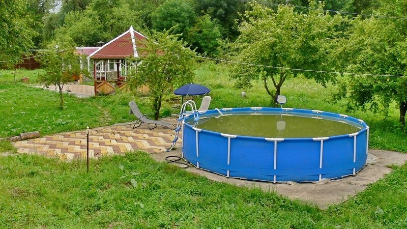 Тип бассейна: открытый бассейн, каркасный бассейнРядом с бассейном: шезлонги, зонтики -