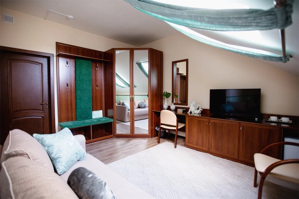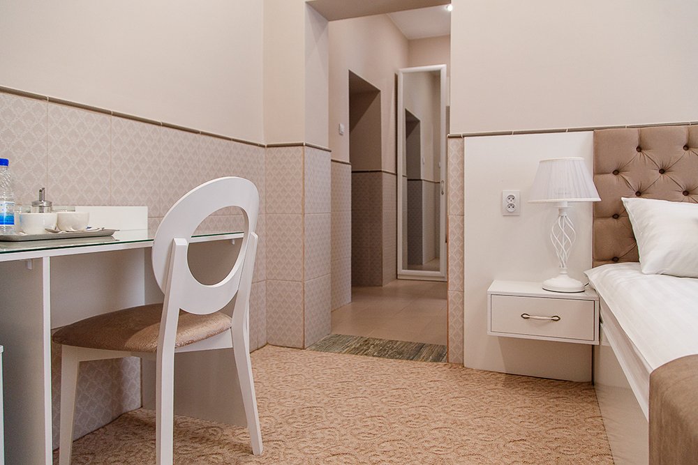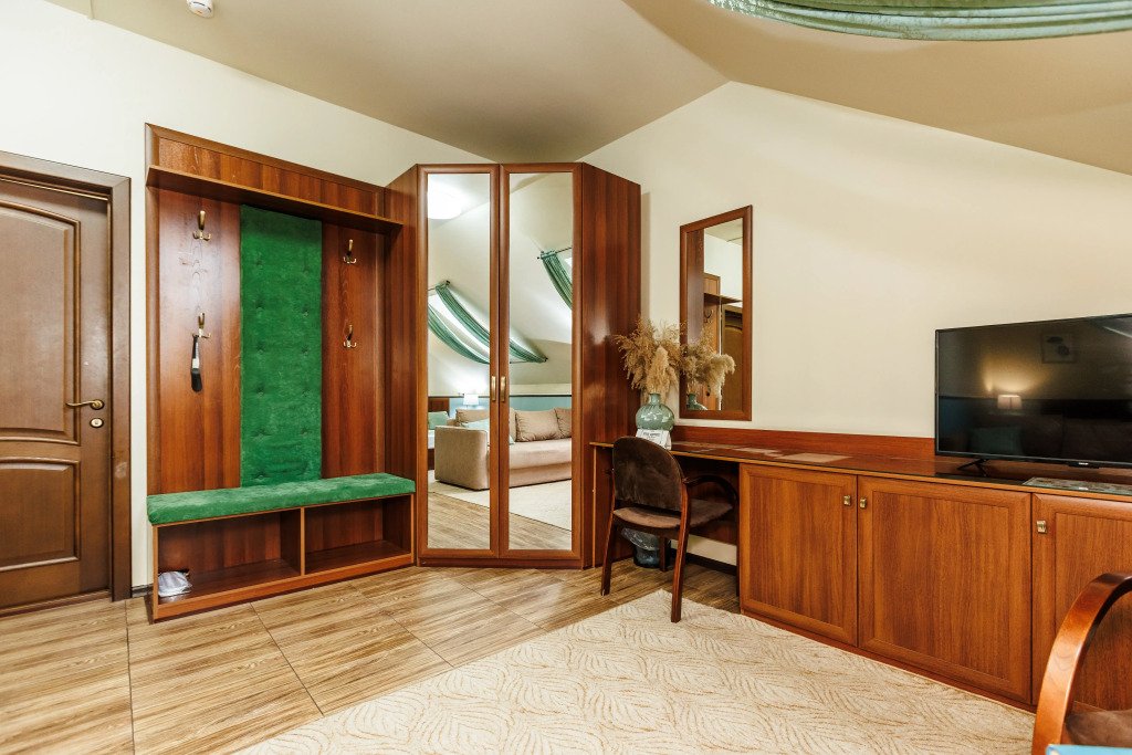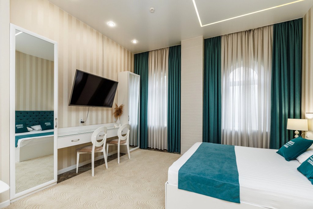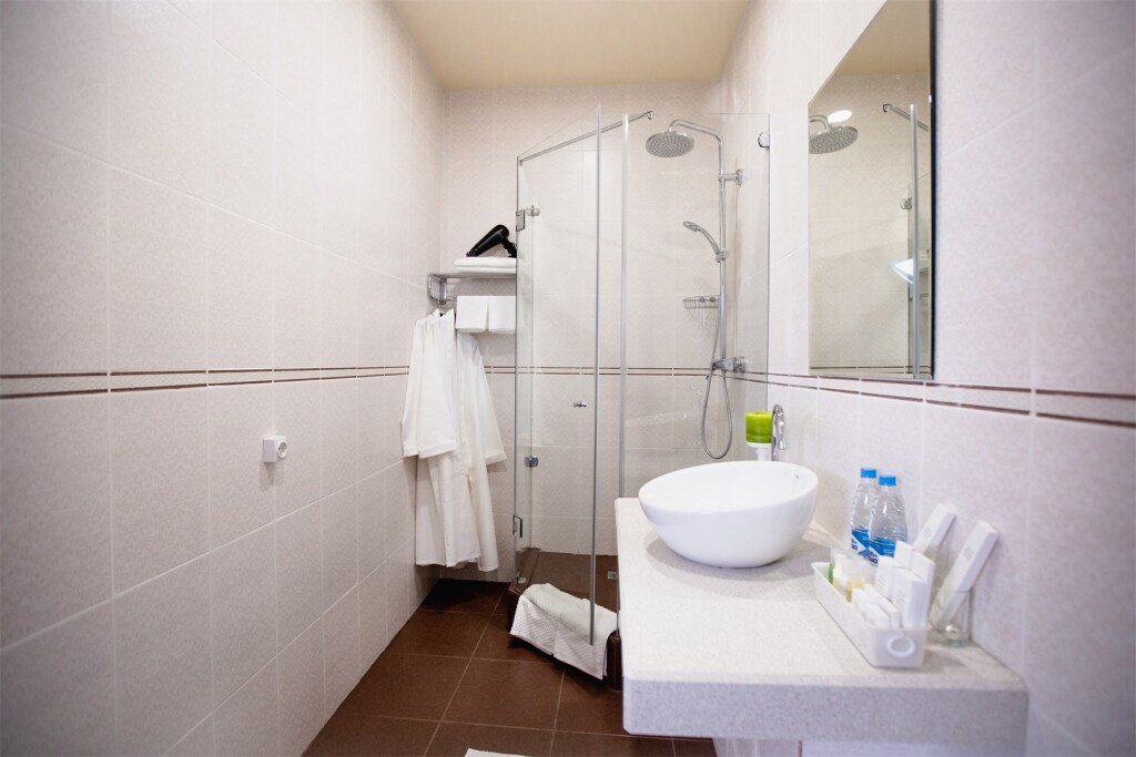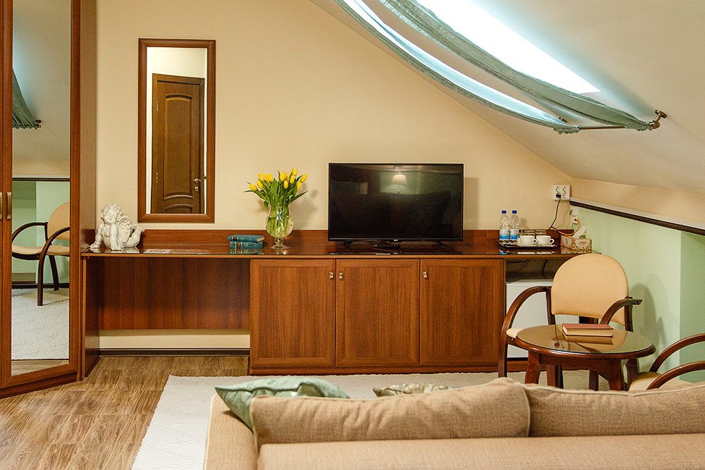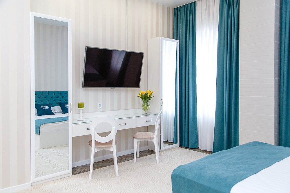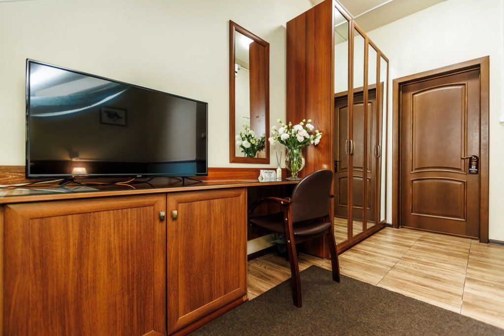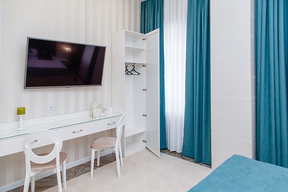 В номере вы найдёте телевизор, мини-бар и халат. Оснащение зависит от выбранной категории номера.