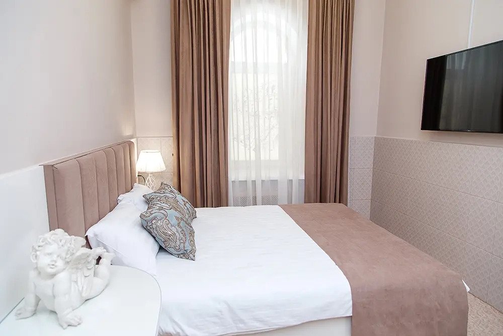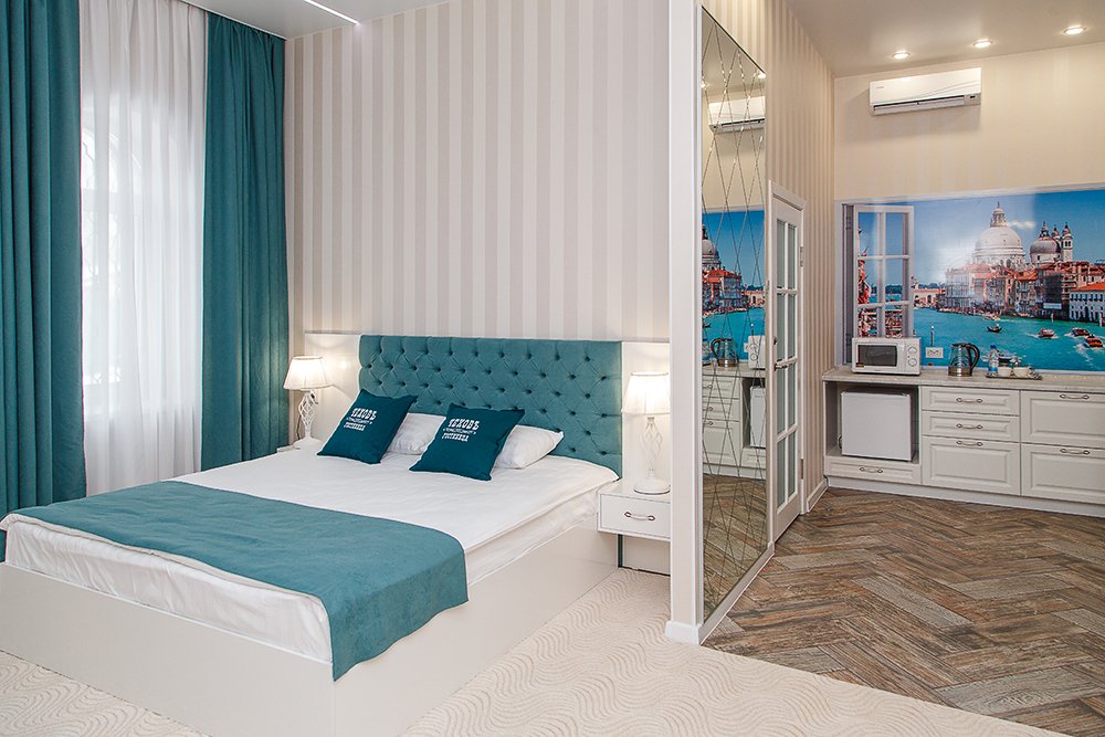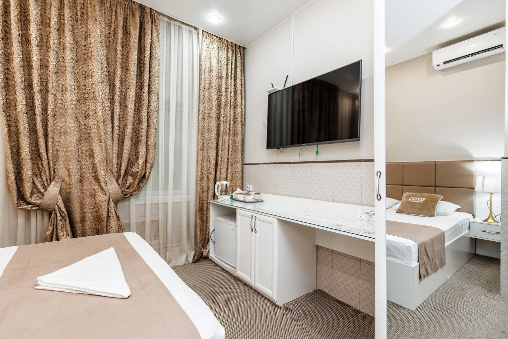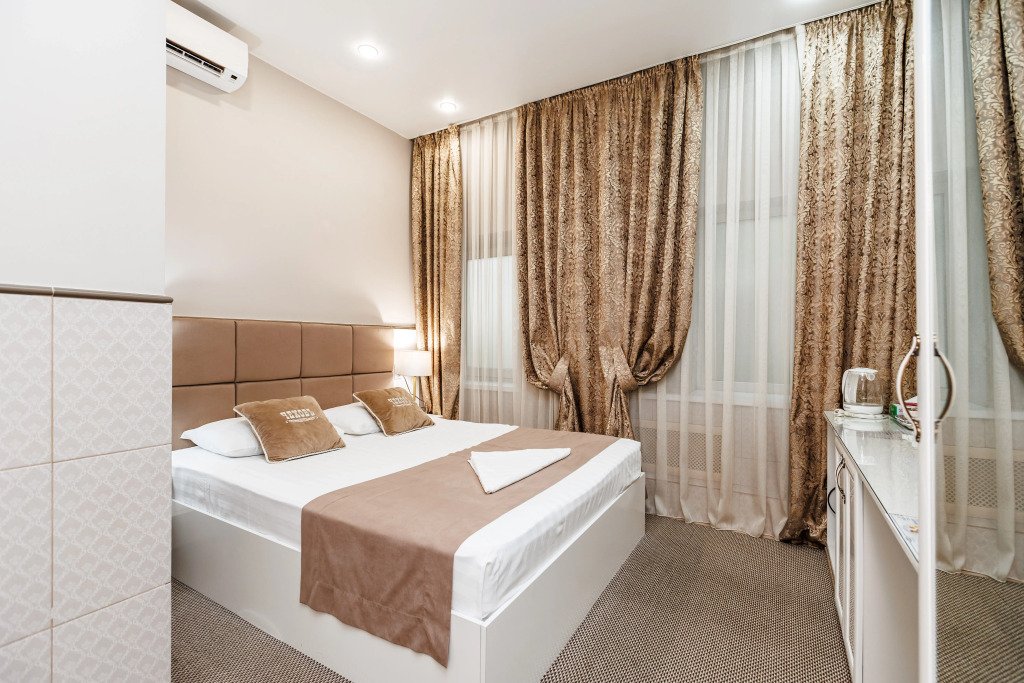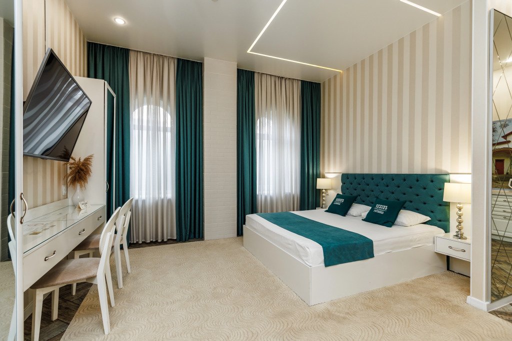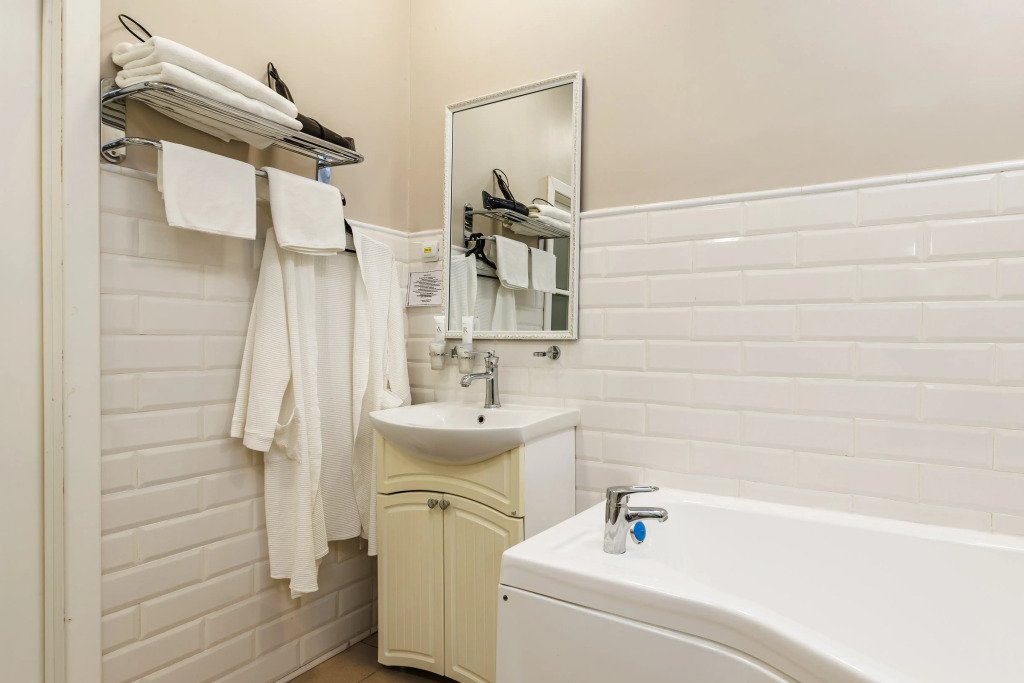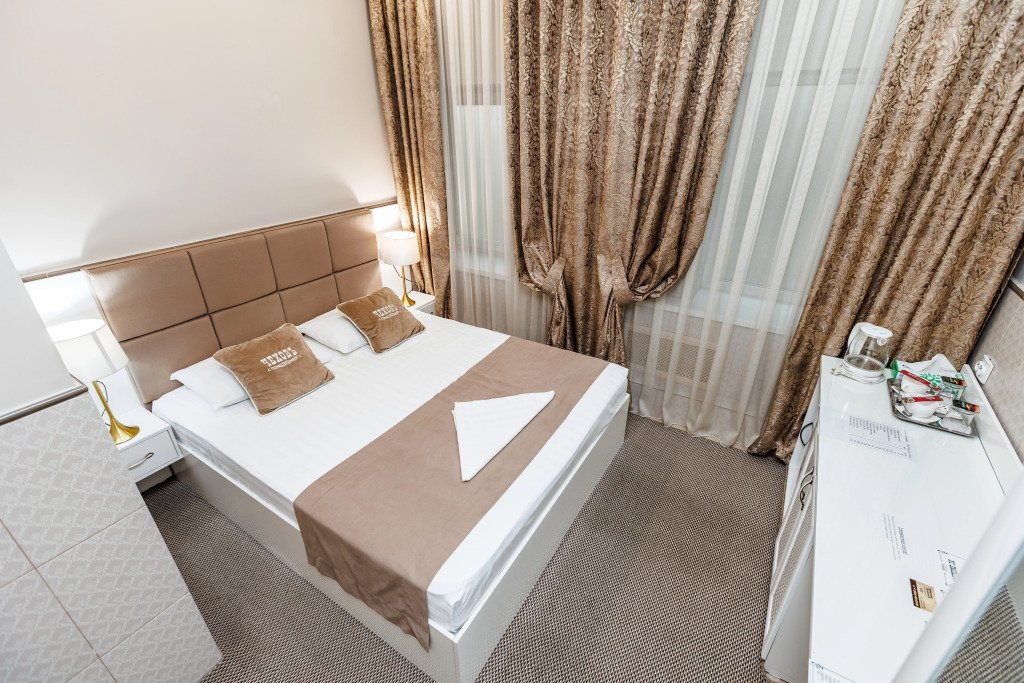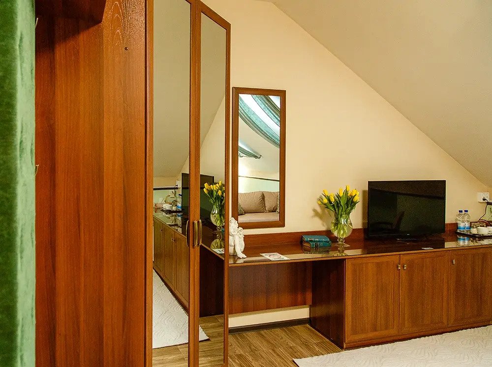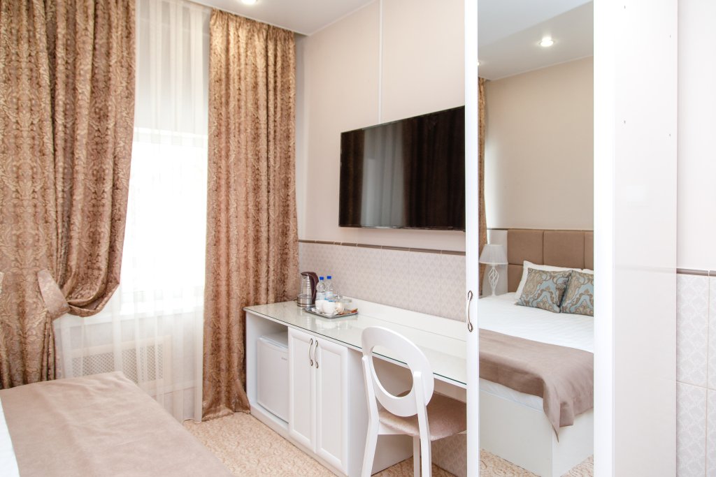 В номере вы найдёте телевизор, мини-бар и халат. Оснащение зависит от выбранной категории номера.