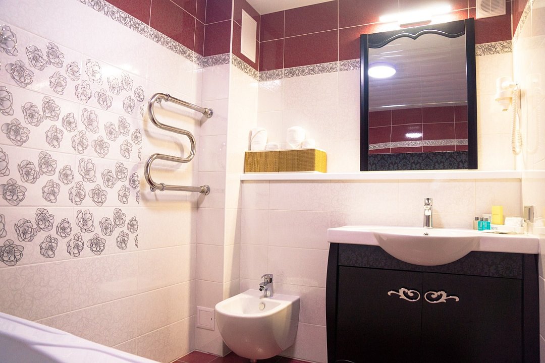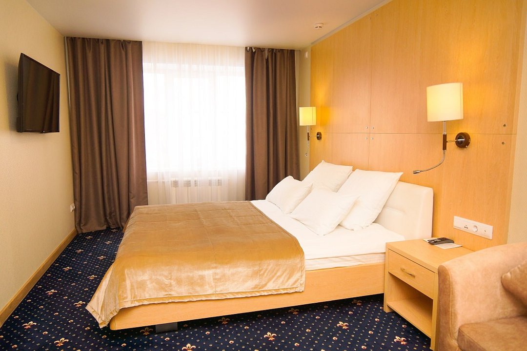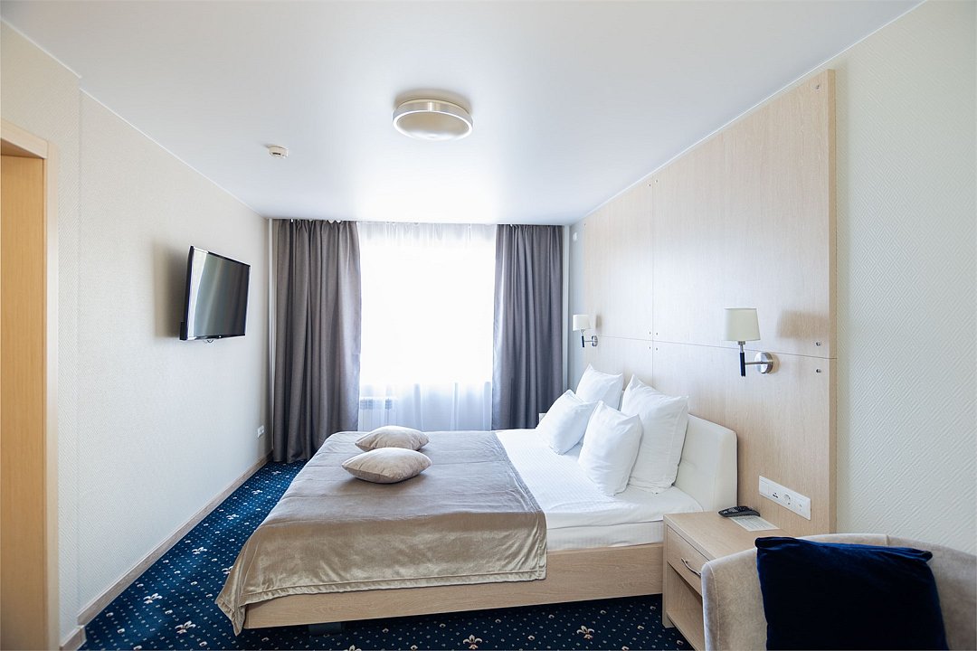 Общая площадь номера составляет - 23 кв.м. Номера категории «Супериор «Комфорт» оформлены в современном стиле по дизайн проекту. Планировка и обустройство номера отвечает требованиям деловых людей и всем тем, кто любит отдыхать с комфортом. Освещение в номере представлено потолочными светильниками и дополнительными источниками света (бра, настольная лампа). В номере: двуспальная кровать (1,8х2,0 м.), прикроватные тумбы, зона отдыха представлена кофейным столиком и двумя полукреслами, платяной шкаф с полкой для багажа, рабочая зона, холодильник, электрический чайник, чайные пары. Ванная комната с ванной или душевой кабиной, где по числу гостей имеются – полотенца, халаты, тапочки, набор гигиенических средств; встроенный фен. Для хранения ценностей и документов в номере имеется сейф. Так же комфортное размещение гостей обеспечивается доступом к высокоскоростной беспроводной сети Интернет Wi-Fi, плазменным телевизором с цифровыми каналами. Нужный микроклимат помещения создаст кондиционер, установленный в номере. Ежедневно в номере проводится влажная уборка и смена полотенец. Номер Супериор «Комфорт» - превосходное решение для деловых людей, ценящих комфортный отдых! * Номера данной категории могут отличаться по эстетическому оформлению ** В номере есть возможность организации дополнительного спального места По желанию гостя, в стоимость номера могут быть добавлены завтраки в любом количестве. Стоимость одного завтрака 300 рублей. Парковка на территории гостиницы платная — до 2 часов 50 руб., свыше 2 часов 170 руб./сут. Всего номеров: 13Услуги и удобства