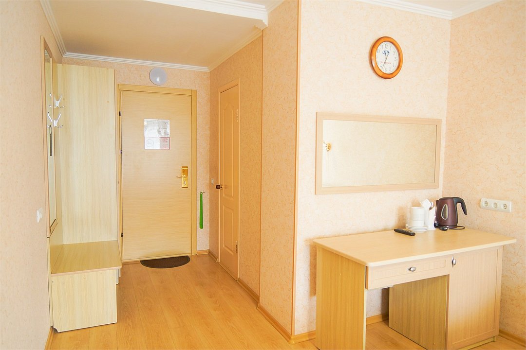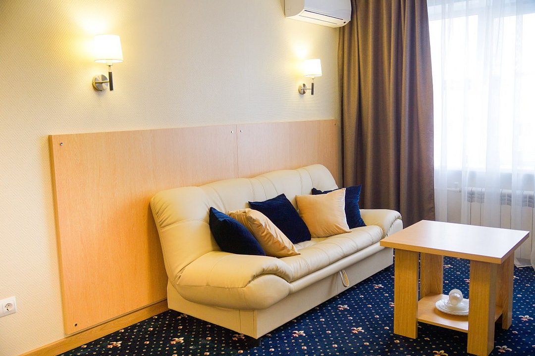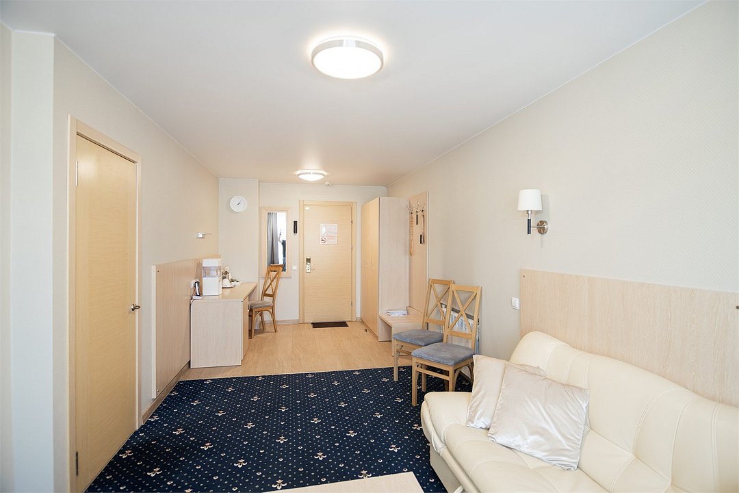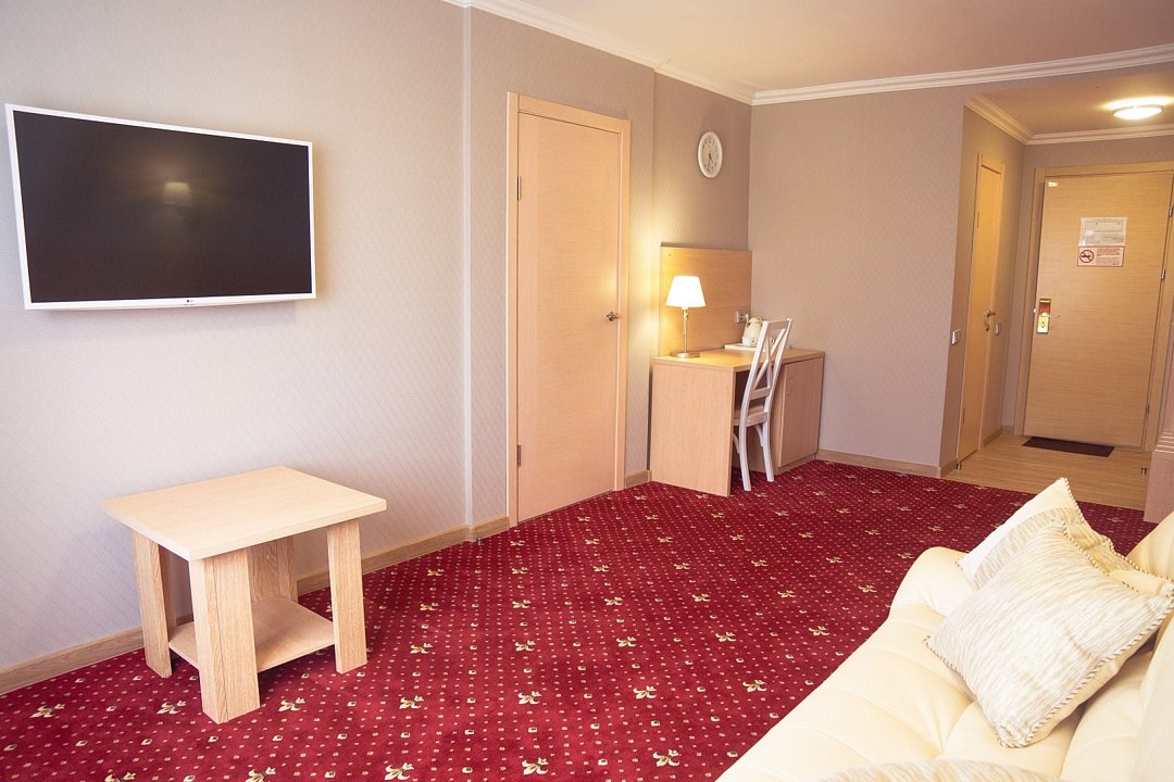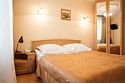 Общая площадь номера составляет - 45 кв.м. Рады представить Вам обновлённые номера категории «Люкс»! Продуманная планировка и современный интерьер в классической цветовой гамме гарантируют Вам приятный отдых в нашем отеле. Люкс (Suite) — комфортабельный двухкомнатный номер для двух или трёх человек с гостиной и спальней. Современная удобная мебель в номерах создает идеальные условия для работы и отдыха. В гостиной есть всё для отдыха, приёма посетителей и работы: комфортабельный мягкий раскладной диван, ковровое покрытие, кондиционер, настенные бра, кофейный столик, ЖК-телевизор с цифровым вещанием, большой рабочий стол, стулья, холодильник, электрический чайник, чайные пары, чай/кофе, бутилированная питьевая вода, набор посуды, столовые приборы, а так же прихожая с вместительным шкафом для удобного хранения вещей, багажная полка, зеркало, ложка и рукавичка для обуви, щетка для одежды, весы. В спальне двуспальная кровать (1,8х2,0 м.), прикроватные тумбы, ЖК телевизор, настенные бра, шкаф для удобного хранения вещей и сейф для хранения ценностей, софа, ковровое покрытие, телефон. Ванная комната оборудована большой ванной (длина 1,8 м.), гигиеническим душем, а так же для пользования имеется расширенный комплект туалетных принадлежностей, халаты, тапочки, фен. Для удобства в номере есть гладильная доска и утюг, весы. Так же комфортное размещение гостей обеспечивается доступом к высокоскоростной беспроводной сети Интернет Wi-Fi. Двухкомнатные комфортабельные номера категории «Люкс» со стильным обновленным интерьером и всеми удобствами ожидают своих гостей! Ежедневно в номере проводится влажная уборка и смена полотенец. * Номера данной категории могут отличаться по эстетическому оформлению **При регистрации заезда необходимо внести депозит в размере 5000 руб. Депозит возвращается при регистрации отъезда, после проверки состояния номера. *** При проживании в номере категории «Люкс» одно место на автопарковке предоставляется бесплатно (предложение действует при наличии свободных мест) **** В номере есть возможность организации дополнительного спального места. Дети до 6-ти лет размещаются бесплатно без предоставления дополнительного спального места. Всего номеров: 2Услуги и удобства