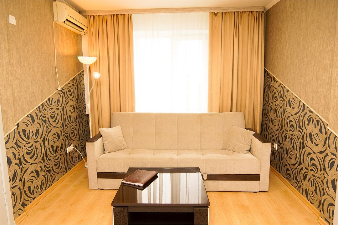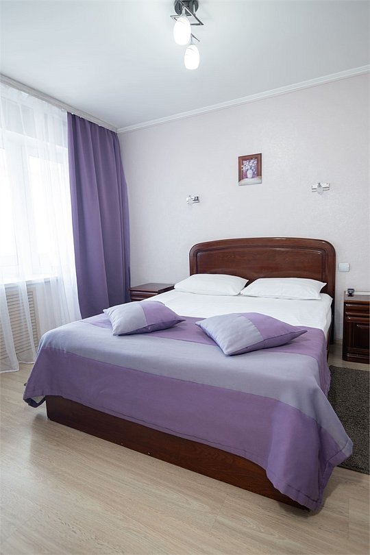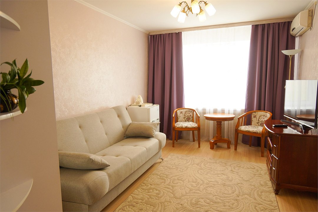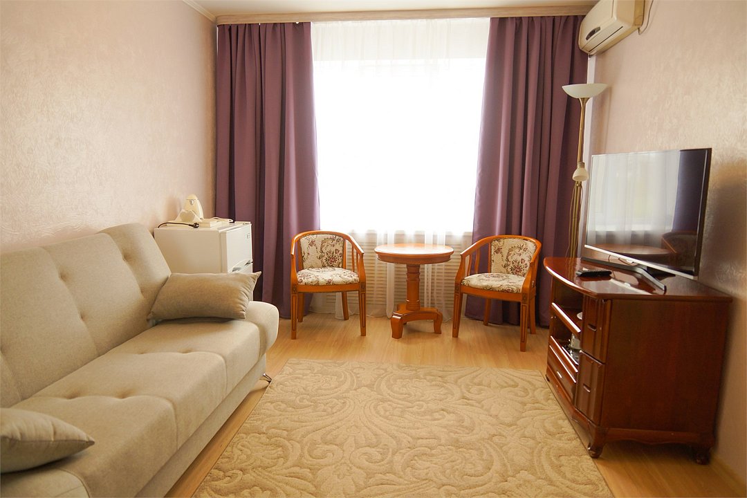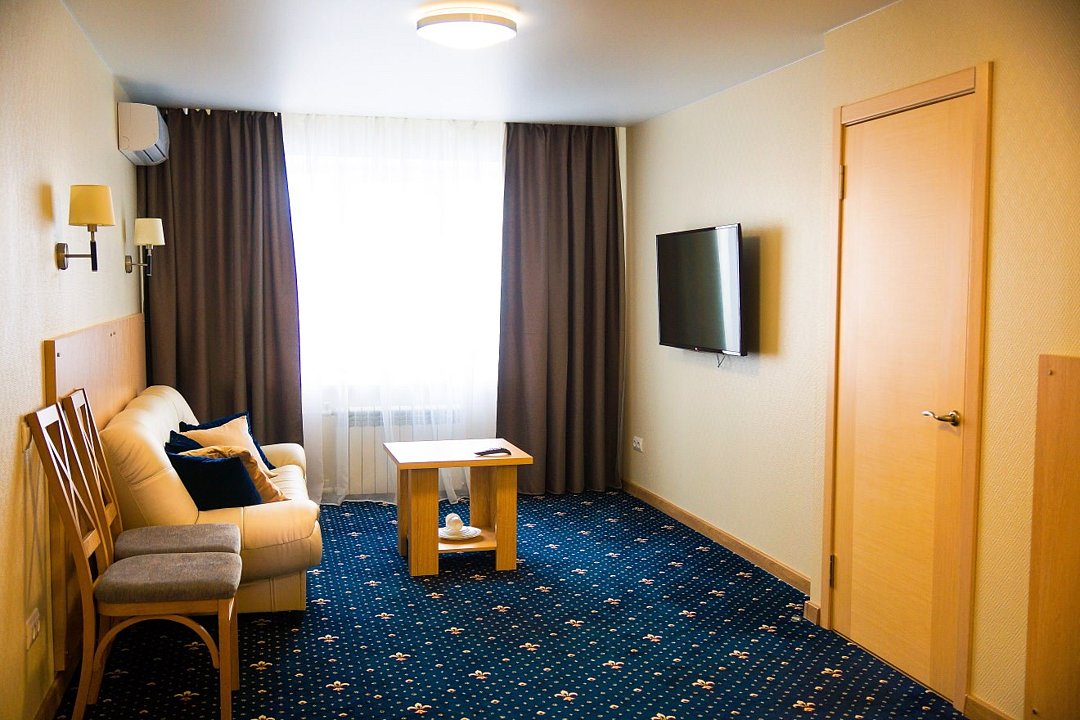 Общая площадь номера составляет - 45 кв.м. Рады представить Вам обновлённые номера категории «Люкс»! Продуманная планировка и современный интерьер в классической цветовой гамме гарантируют Вам приятный отдых в нашем отеле. Люкс (Suite) — комфортабельный двухкомнатный номер для двух или трёх человек с гостиной и спальней. Современная удобная мебель в номерах создает идеальные условия для работы и отдыха. В гостиной есть всё для отдыха, приёма посетителей и работы: комфортабельный мягкий раскладной диван, ковровое покрытие, кондиционер, настенные бра, кофейный столик, ЖК-телевизор с цифровым вещанием, большой рабочий стол, стулья, холодильник, электрический чайник, чайные пары, чай/кофе, бутилированная питьевая вода, набор посуды, столовые приборы, а так же прихожая с вместительным шкафом для удобного хранения вещей, багажная полка, зеркало, ложка и рукавичка для обуви, щетка для одежды, весы. В спальне двуспальная кровать (1,8х2,0 м.), прикроватные тумбы, ЖК телевизор, настенные бра, шкаф для удобного хранения вещей и сейф для хранения ценностей, софа, ковровое покрытие, телефон. Ванная комната оборудована большой ванной (длина 1,8 м.), гигиеническим душем, а так же для пользования имеется расширенный комплект туалетных принадлежностей, халаты, тапочки, фен. Для удобства в номере есть гладильная доска и утюг, весы. Так же комфортное размещение гостей обеспечивается доступом к высокоскоростной беспроводной сети Интернет Wi-Fi. Двухкомнатные комфортабельные номера категории «Люкс» со стильным обновленным интерьером и всеми удобствами ожидают своих гостей! Ежедневно в номере проводится влажная уборка и смена полотенец. * Номера данной категории могут отличаться по эстетическому оформлению **При регистрации заезда необходимо внести депозит в размере 5000 руб. Депозит возвращается при регистрации отъезда, после проверки состояния номера. *** При проживании в номере категории «Люкс» одно место на автопарковке предоставляется бесплатно (предложение действует при наличии свободных мест) **** В номере есть возможность организации дополнительного спального места. Дети до 6-ти лет размещаются бесплатно без предоставления дополнительного спального места. Всего номеров: 2Услуги и удобства