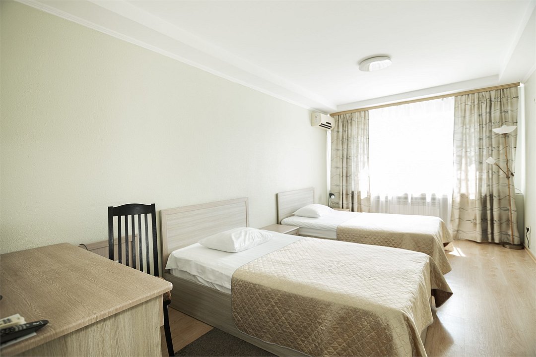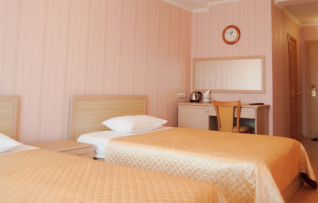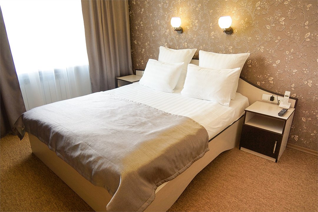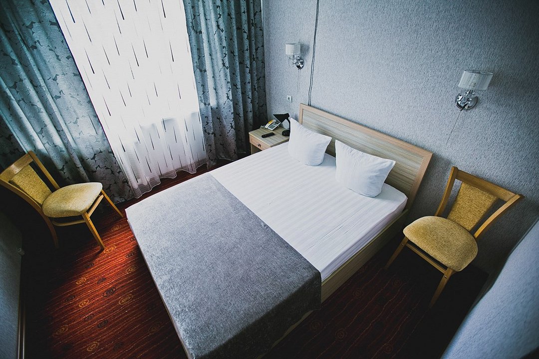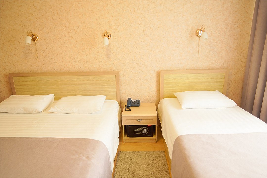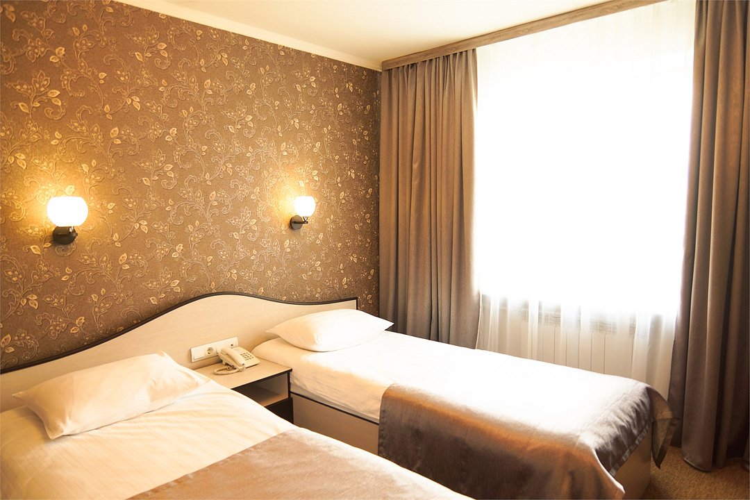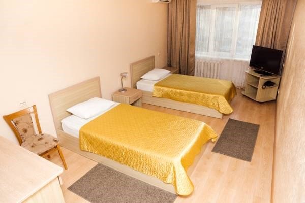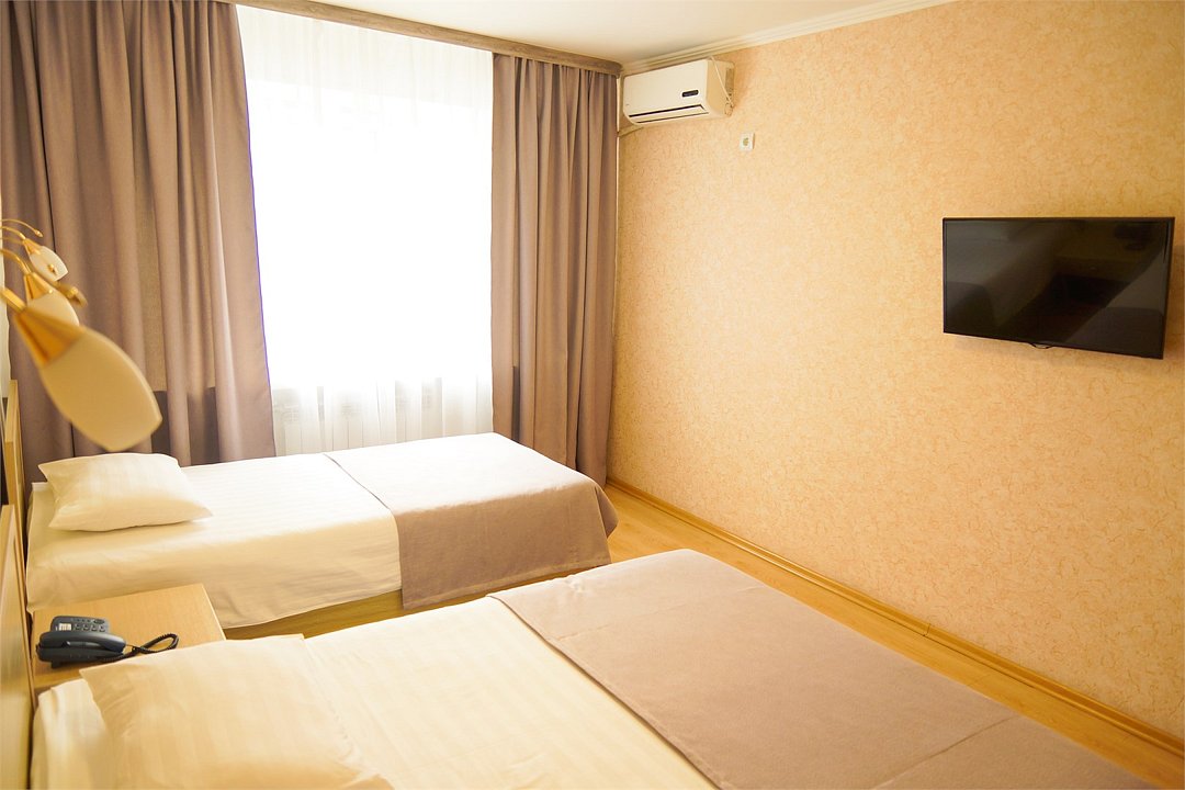 Общая площадь номера составляет - 23 кв.м Двухместные номера стандарт это однокомнатные номера с двумя раздельными кроватями (0,9х2,0 м. или 1,0х2,0 м.), прикроватными тумбами, журнальным столиком, банкетками, холодильником, электрочайником, чайными парами. Номера данной категории подходят для тех, кто путешествует вдвоём и стремится обеспечить комфортное проживание при минимальном бюджете. Номера обеспечивают всё необходимое для длительного проживания и обеспечения рабочих визитов (в некоторых номерах данной категории имеется рабочая зона). Номера оборудованы собственной ванной комнатой с ванной, полотенца, набор гигиенических средств, тапочки. Комфортное размещение гостей обеспечивается доступом к высокоскоростной беспроводной сети Интернет Wi-Fi, плазменным телевизором с цифровыми каналами. Нужный микроклимат помещения создаст кондиционер, установленный в номере. Ежедневно в номере проводится влажная уборка и смена полотенец. * Номера данной категории могут отличаться по эстетическому оформлению ** В номере есть возможность организации дополнительного спального места По желанию гостя, в стоимость номера могут быть добавлены завтраки в любом количестве. Стоимость одного завтрака 300 рублей. Парковка на территории гостиницы платная — до 2 часов 50 руб., свыше 2 часов 170 руб./сут. Всего номеров: 20Услуги и удобства