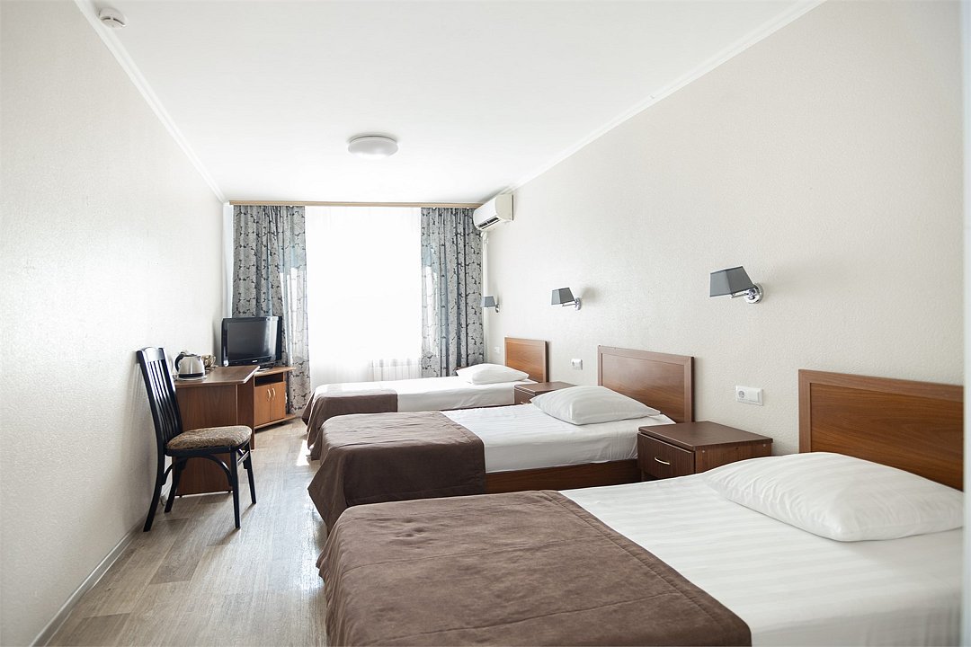 Общая площадь номера составляет - 23 кв.м Семейный номер с тремя кроватями обеспечивает своим гостям комфортное и недорогое проживание при трехместном размещении. Номер подходит для размещения коллег или друзей. Уютный, стандартный номер со всеми удобствами: три односпальные кровати (0,9х2,0 м. или 1,0х2,0 м.), прикроватные тумбы для хранения личных вещей, платяной шкаф, банкетки, журнальный столик, электрический чайник, чайные пары, холодильник, телевизор с цифровым вещанием. Собственная ванная комната с ванной, полотенца, набор гигиенических средств, тапочки. Так же комфортное размещение гостей обеспечивается доступом к высокоскоростной беспроводной сети Интернет Wi-Fi. Нужный микроклимат помещения создаст кондиционер, установленный в номере. Ежедневно в номере проводится влажная уборка и смена полотенец. * Номера данной категории могут отличаться по эстетическому оформлению По желанию гостя, в стоимость номера могут быть добавлены завтраки в любом количестве. Стоимость одного завтрака 300 рублей. Парковка на территории гостиницы платная — до 2 часов 50 руб., свыше 2 часов 170 руб./сут. Всего номеров: 8Услуги и удобства