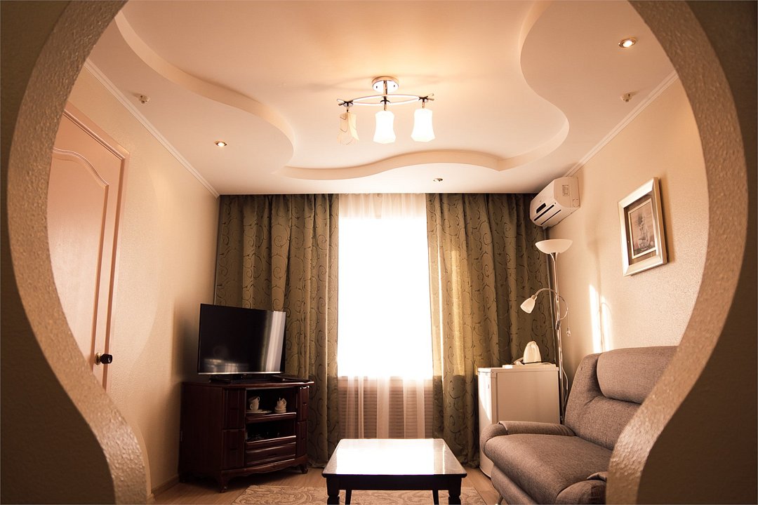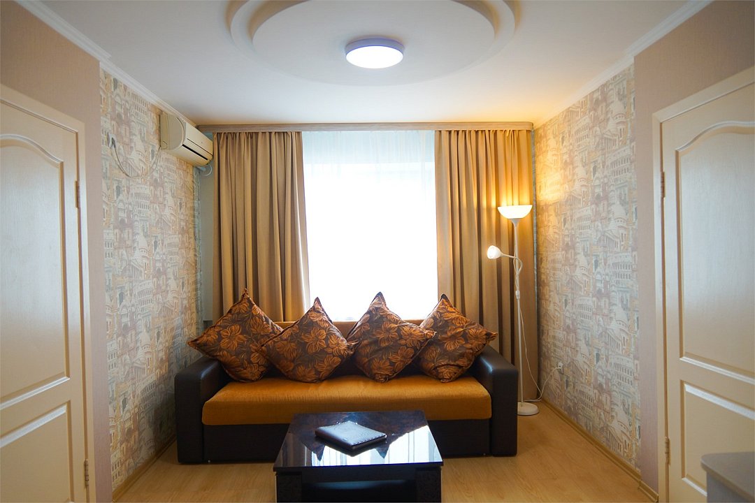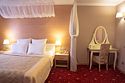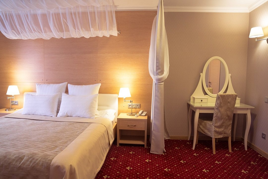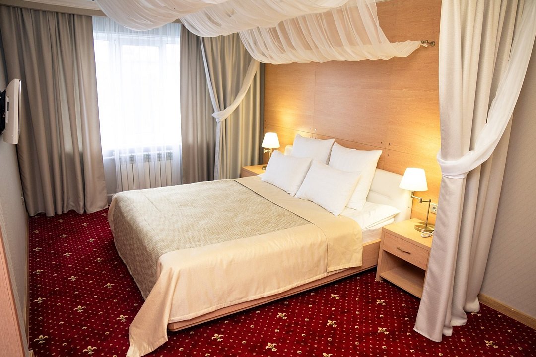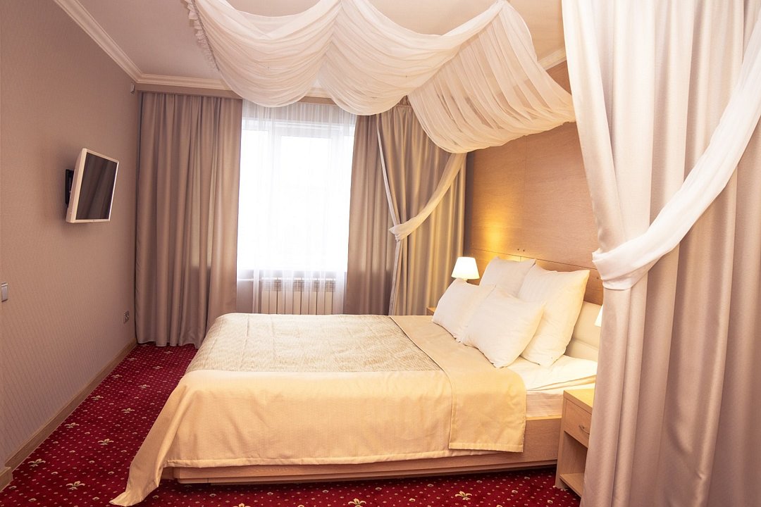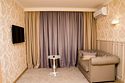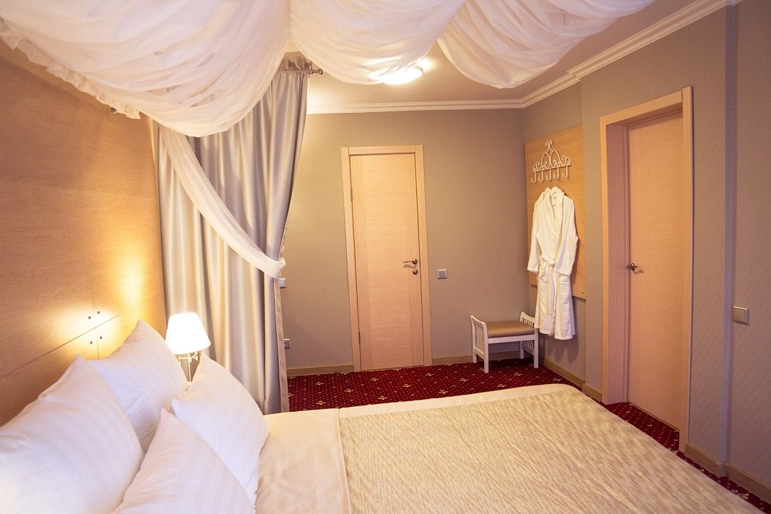 Общая площадь номера составляет - 45 кв. м. Великолепный двухкомнатный номер подойдет семейным парам и влюблённым для отдыха. Сочетание современного интерьера, комфорта и уюта подарит Вам ощущение счастья и радости. Номер «Люкс Премьер» с дизайнерским ремонтом выполнен в современном стиле с гостиной и уютной спальной зонами. Дизайн номера выполнен в бежево-бордовых тонах. Общее оформление номера создает идеальную атмосферу романтики. Две комнаты номера позволят с комфортом разместиться для отдыха и проведения встреч. Номер представлен – Спальней с двуспальной кроватью (1,8х2,0 м.) и оригинально оформленным балдахином, создающим атмосферу легкости, воздушности и необычайного комфорта, прикроватные тумбы, телефон, индивидуально кодируемый сейф для хранения ценных вещей, туалетный столик. В гостиной имеется рабочая зона, холодильник, электрический чайник, чайные пары и всё необходимое для приготовления чая или кофе, а так же набор посуды и столовые приборы. Зона отдыха представленная кожаным раскладным диваном, настенными бра, кофейным столиком, широкоэкранным плазменным телевизором с цифровым вещанием. Ванная комната оборудована ванной «на двоих» (1,2х1,7 м.) с подголовниками для полного расслабления после напряженного дня, биде, встроенным феном, набором полотенец, махровыми халатами, тапочками, расширенным набором гигиенических средств. Для удобства в номере есть гладильная доска и утюг. Так же в номере имеется прихожая с вместительным шкафом и багажной полкой, гостевой санузел. Нужный микроклимат помещения создаст кондиционер, установленный в номере. Ежедневно в номере проводится влажная уборка и смена полотенец. Бронировать номер «Люкс Премьер» стоит заранее, т. к. он представлен в эксклюзивном варианте! *При регистрации заезда необходимо внести депозит в размере 5000 руб. Депозит возвращается при регистрации отъезда, после проверки состояния номера. *** При проживании в номере категории «Люкс» одно место на автопарковке предоставляется бесплатно (предложение действует при наличии свободных мест) ** В номере есть возможность организации дополнительного спального места По желанию гостя, в стоимость номера могут быть добавлены завтраки в любом количестве. Стоимость одного завтрака 300 рублей. Всего номеров: 1Услуги и удобства