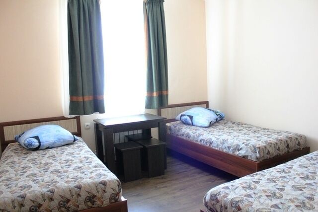 Три односпальные кровати, ТВ, стол, стулья, душ и туалет на этаже.