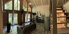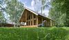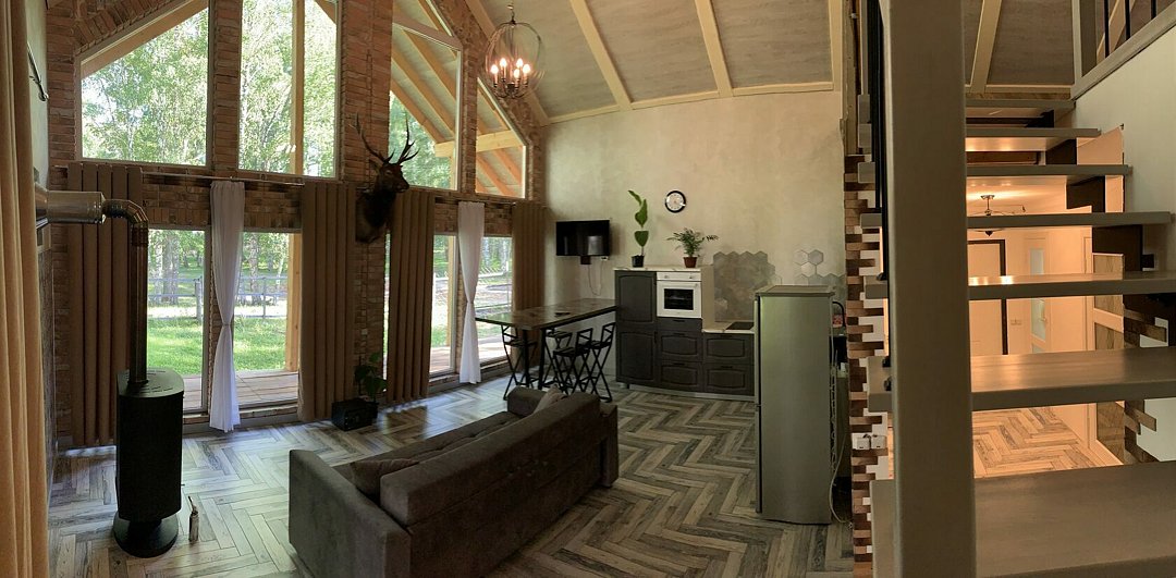 Отдельный коттедж выполнен в двухуровневом исполнении с панорамными окнами. Второй этаж открытого типа, с него просматривается холл первого этажа.