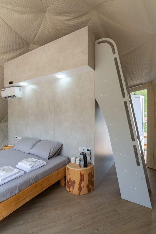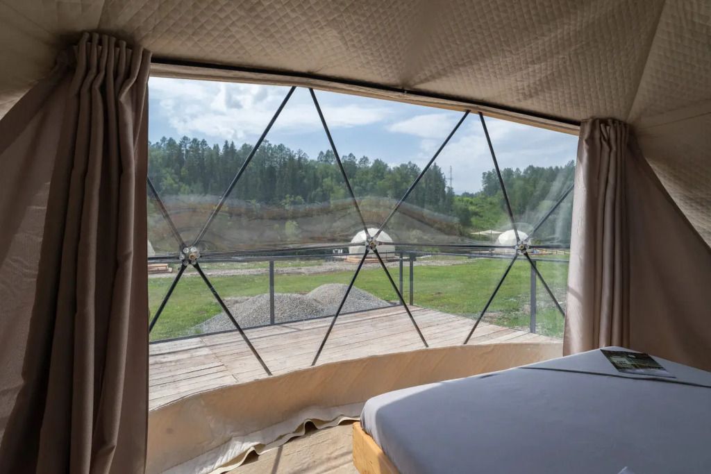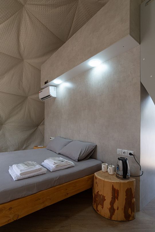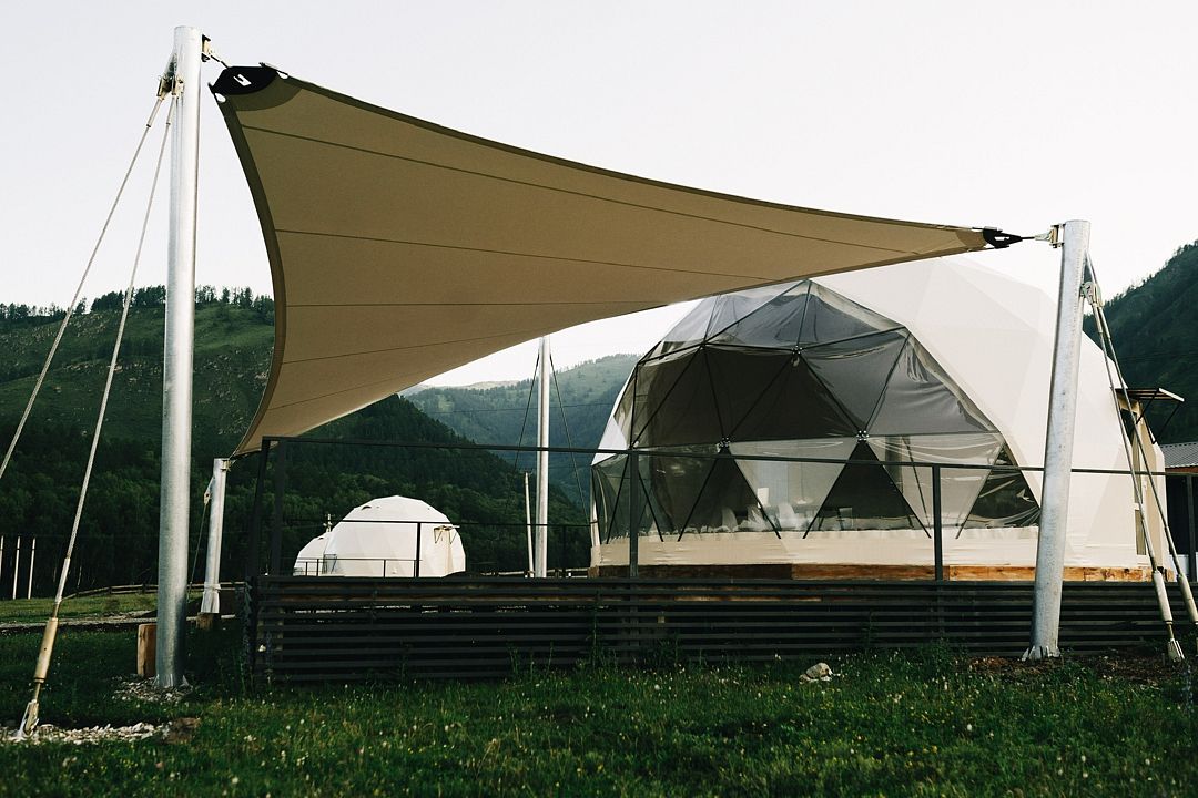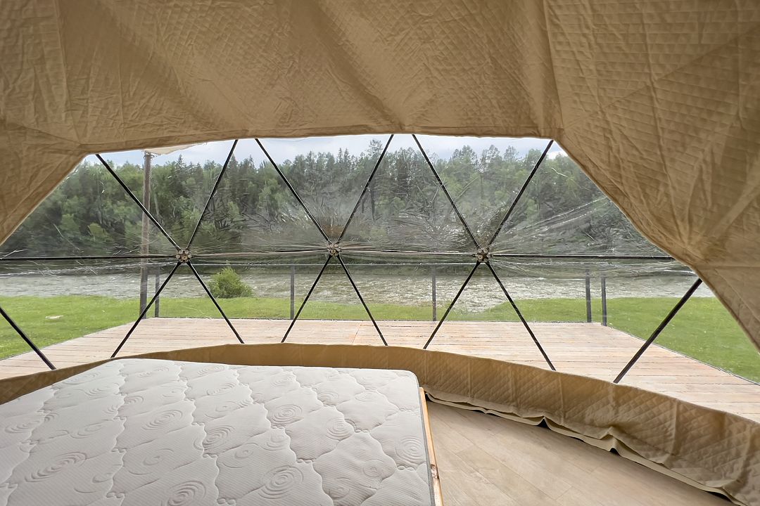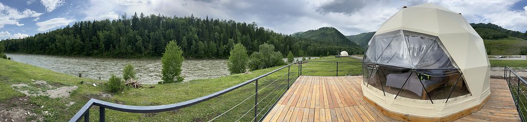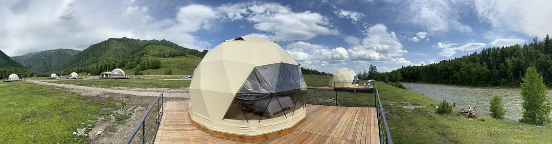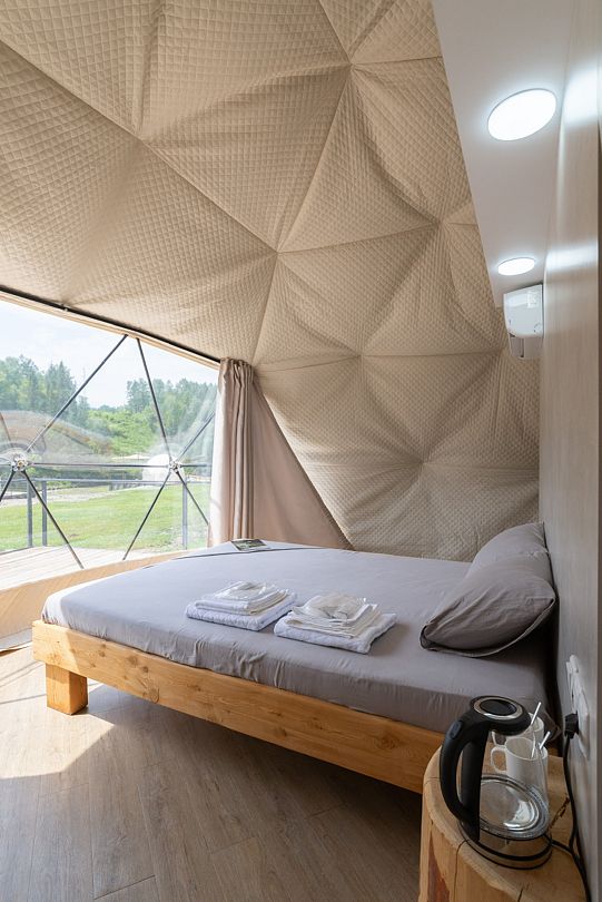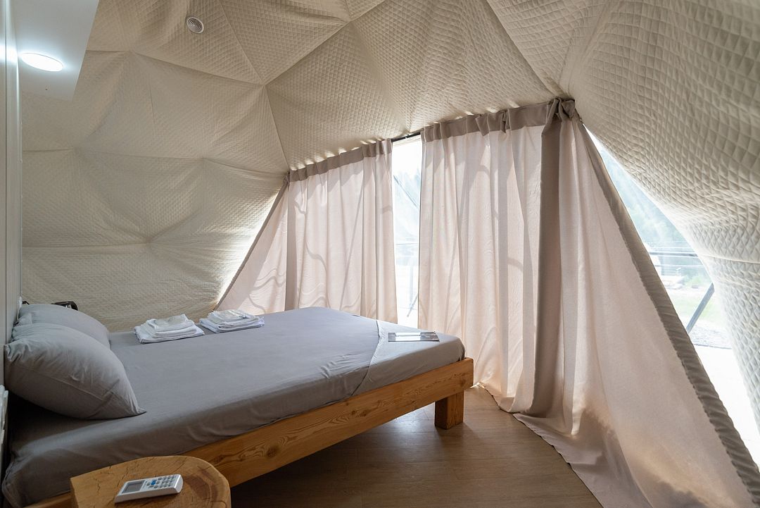 Купольный номер с прекрасным видом на горы, реку и звездное небо. В каждом номере есть всё необходимое для комфортного проживания: две удобных двуспальных кровати, с/у, кондиционер, тёплый пол, белоснежные халаты, индивидуальные средства личной гигиены, чайник и чайные принадлежности.