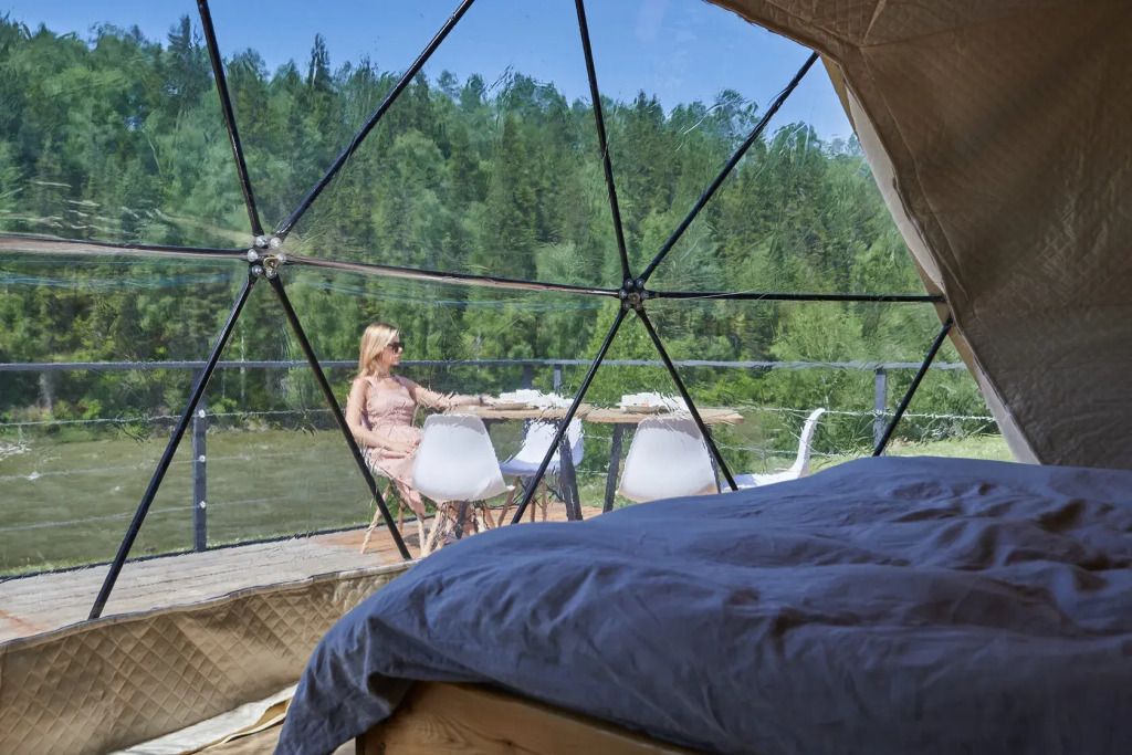Для размещения доступны уютные шатры, оборудованные удобными кроватями, ванной комнатой, туристическим набор, кондиционером, тёплыми полами, халатами и прочими удобствами. Через панорамные окна можно любоваться горами, звёздным небом и рекой.
