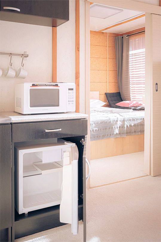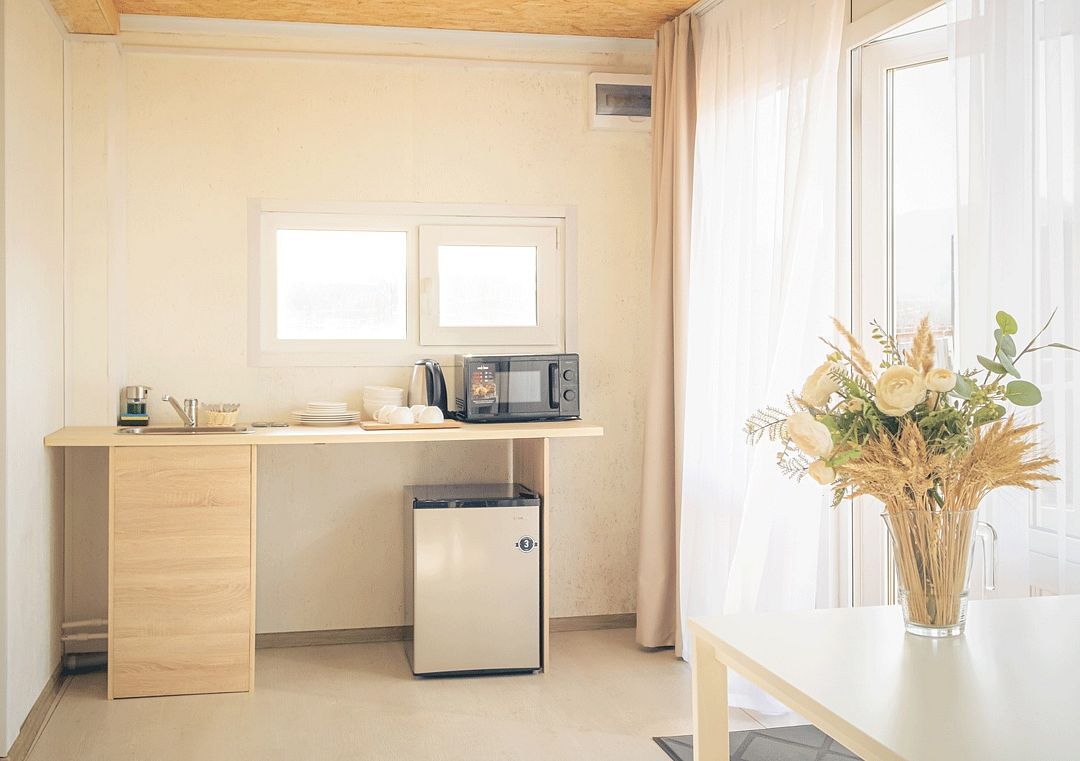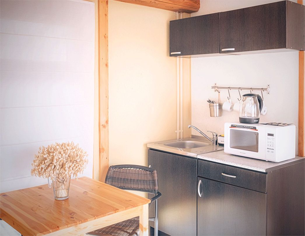 Кухонный уголок: холодильник, свч-печь, чайник, раковина, посуда, чай, питьевая вода, (мультиварка по запросу).