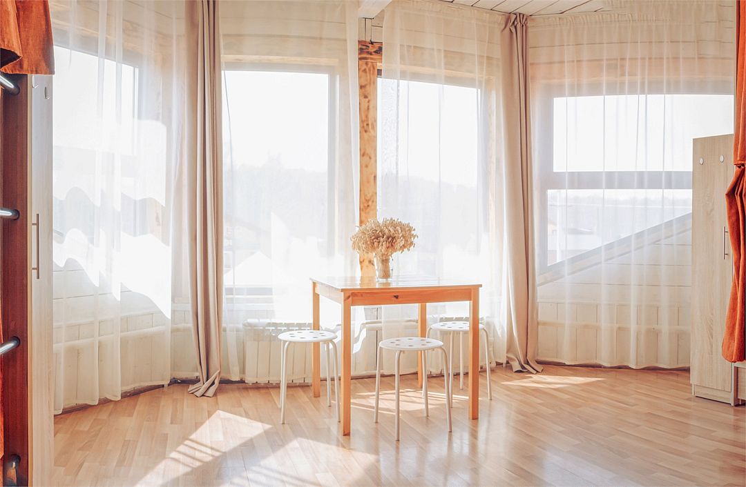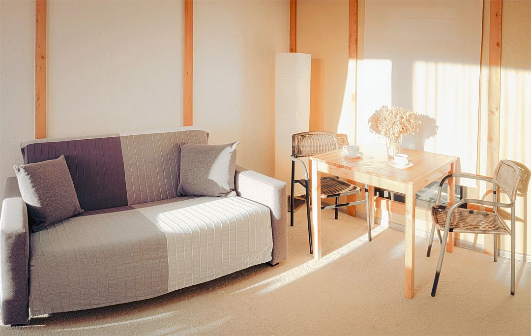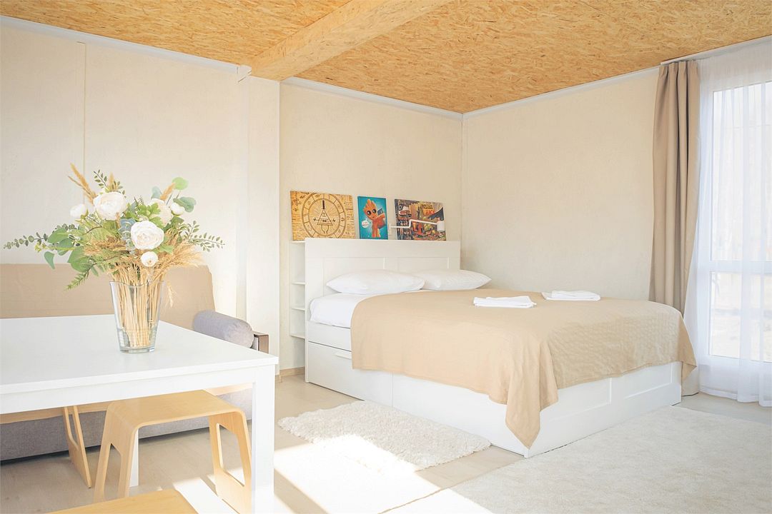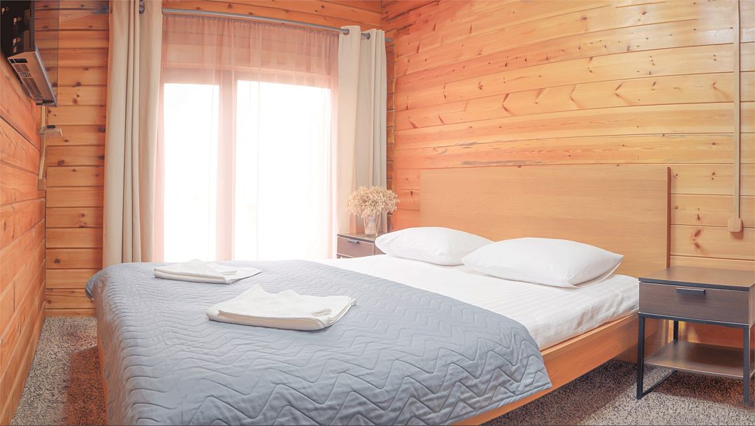Спальные места: 4 основных (двуспальная кровать и раскладной диван). Есть возможность поставить 1 дополнительное (еврораскладушка).