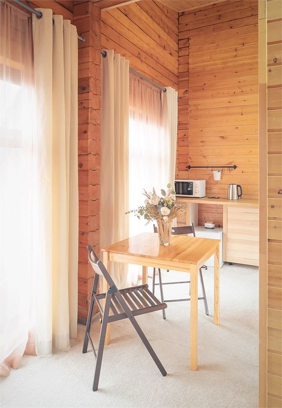 Однокомнатные комфортабельные тентовые дома с террасой, 12 кв м. Расположены на дополнительной территории турбазы, в шаговой доступности от основной. Для отопления используются инфракрасные лампы, простыни с подогревом, радиатор. На террасе лавочка и гамак. Wi-fi.