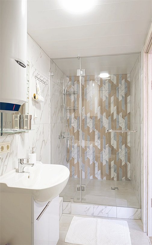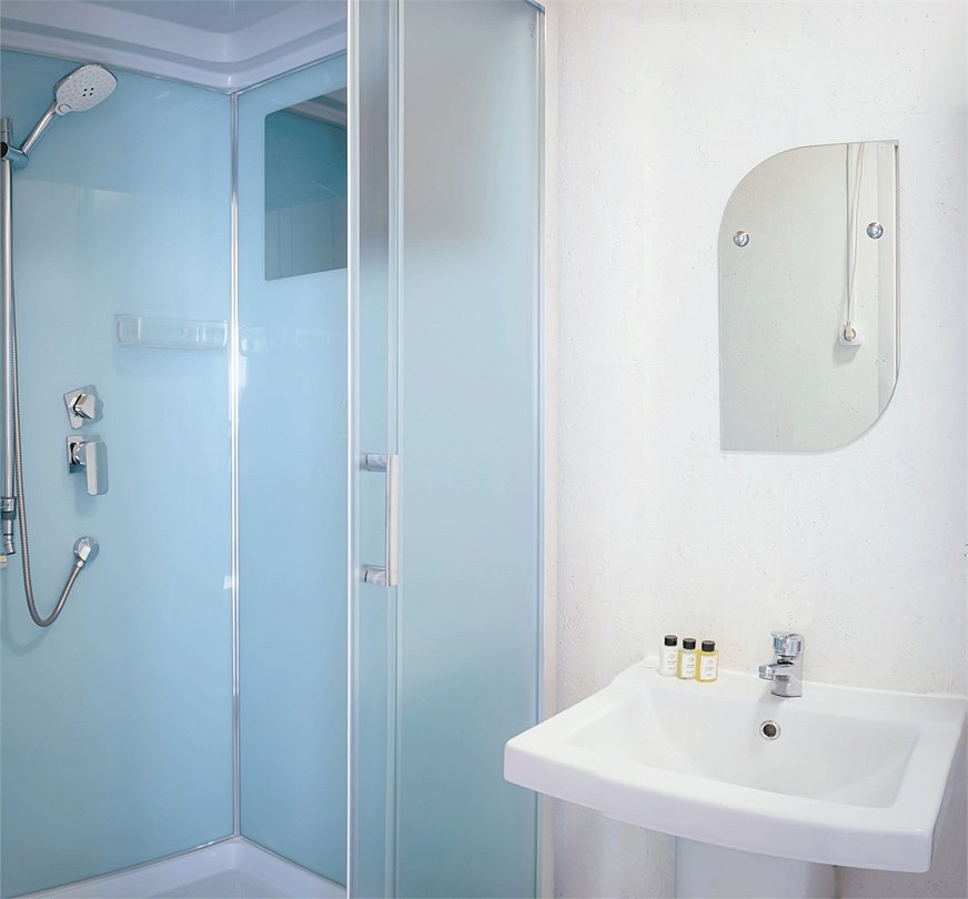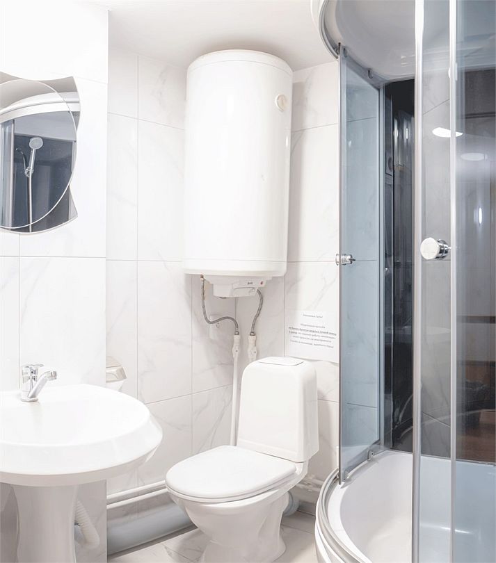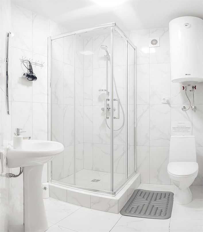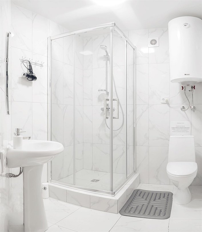 Собственная ванная комната в номере: раковина, унитаз, душевая кабина. Полотенца, фен, душевые принадлежности (шампунь, гель для душа, мыло).