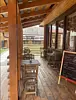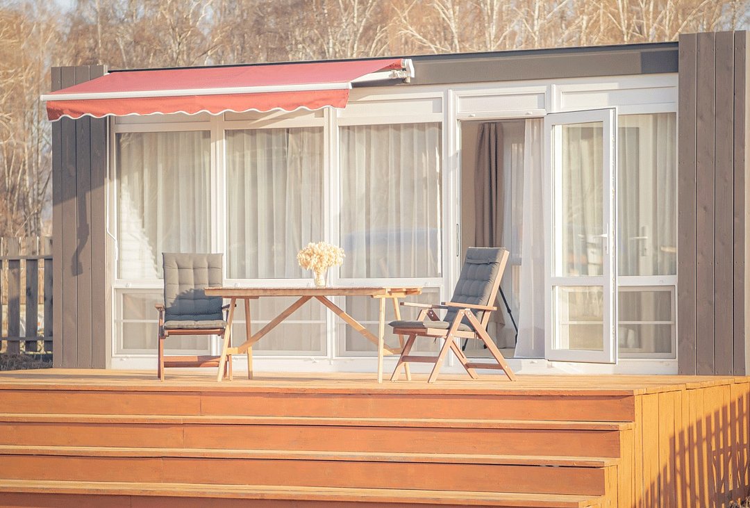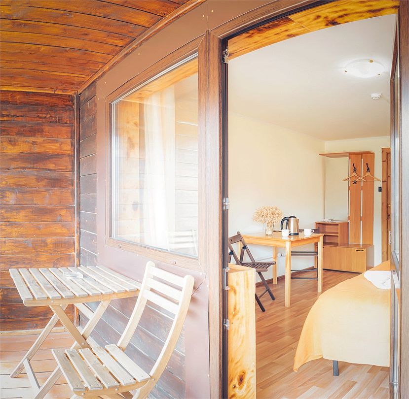 Однокомнатный дом с террасой (в единственном варианте), 28 кв м, 1 этаж. Расположен на дополнительной территории турбазы в шаговой доступности от основной. На террасе стол и стулья (гриль по запросу). Wi-fi.