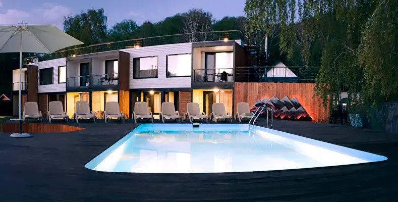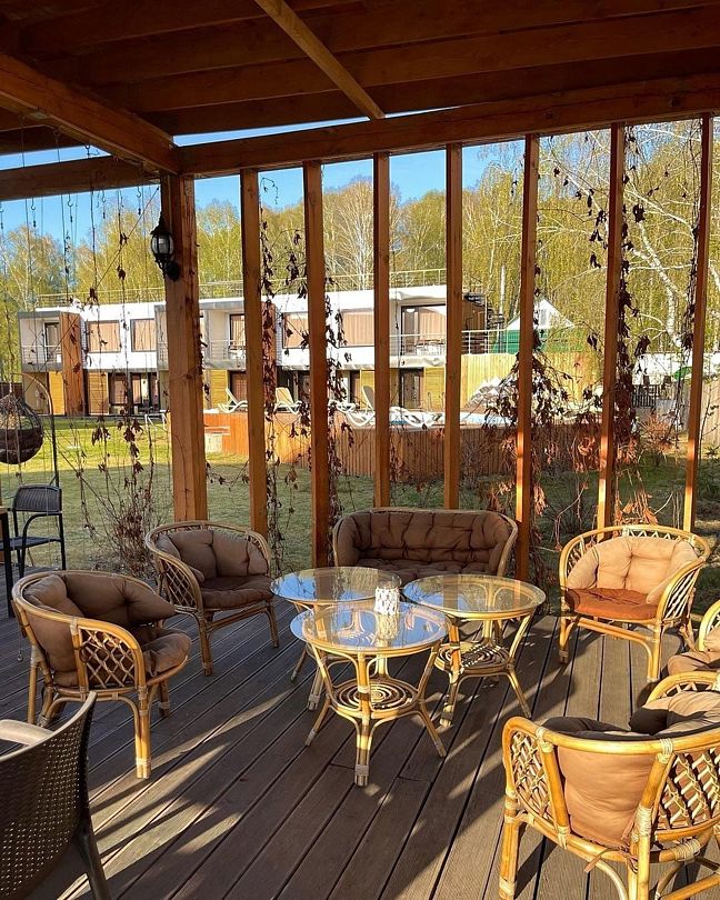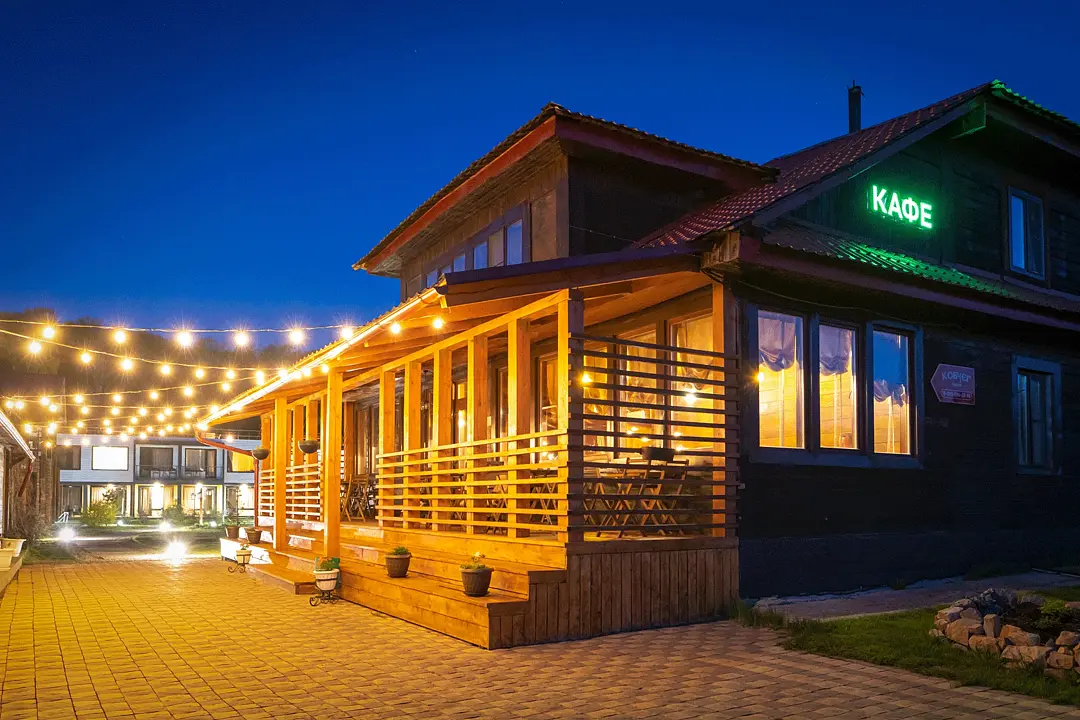На территории есть кафе, подогреваемый бассейн, баня, беседка с камином, мангальные зоны, детские и спортивные площадки.