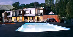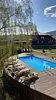Есть бассейн с подогреваемой водой, веранда на крыше, беседки, бани, чудесная лужайка и отличное расположение вдали от дороги и вблизи рек.