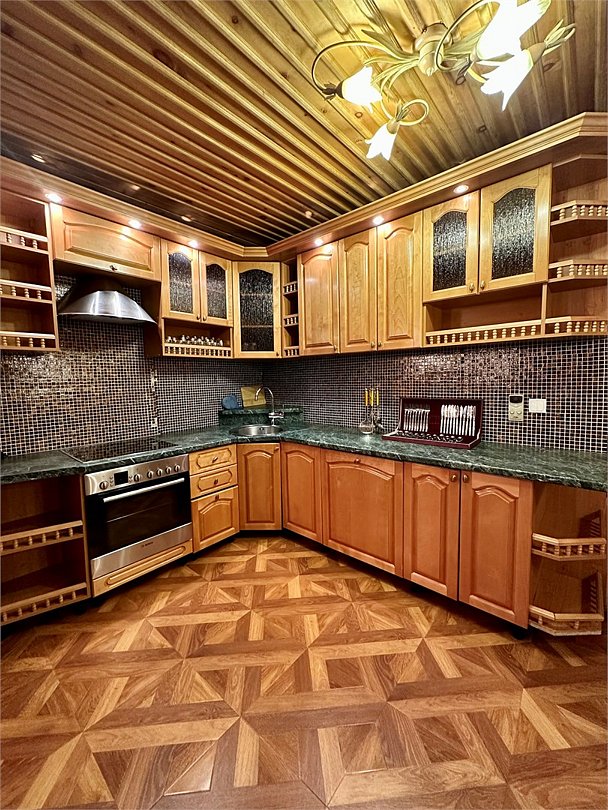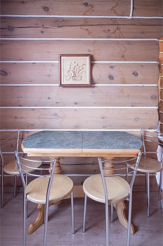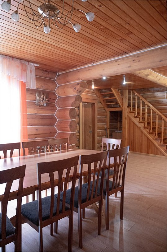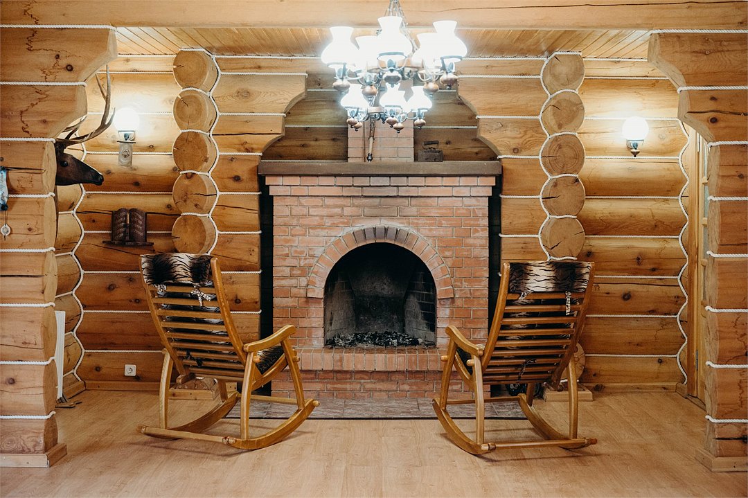 Гостиная: кресла у камина, журнальный столик, кабельное TV, обеденный стол, стулья, охотничьи трофеи. Кухонная зона: кухонный гарнитур, СВЧ-печь, духовой шкаф, электрический чайник, заварочный чайник, двухкамерный холодильник, набор посуды, мойка, консервный нож, штопор.
