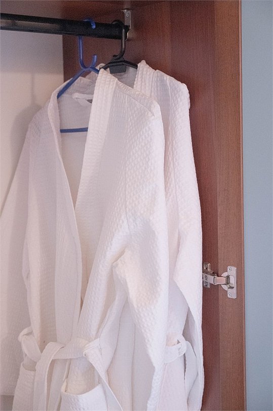 Три спальни на втором этаже: в одной — двуспальная кровать, прикроватные тумбочки, шкаф и вешалка для одежды, бра, 2 халата, кабельное TV; во второй — двуспальная кровать, прикроватные тумбочки, вешалка для одежды, 2 халата, кресло, кабельное TV и выход на балкон; в третьей — двуспальная кровать, прикроватные тумбочки, шкаф и вешалка для одежды, 2 халата, кресло, кондиционер, кабельное TV.