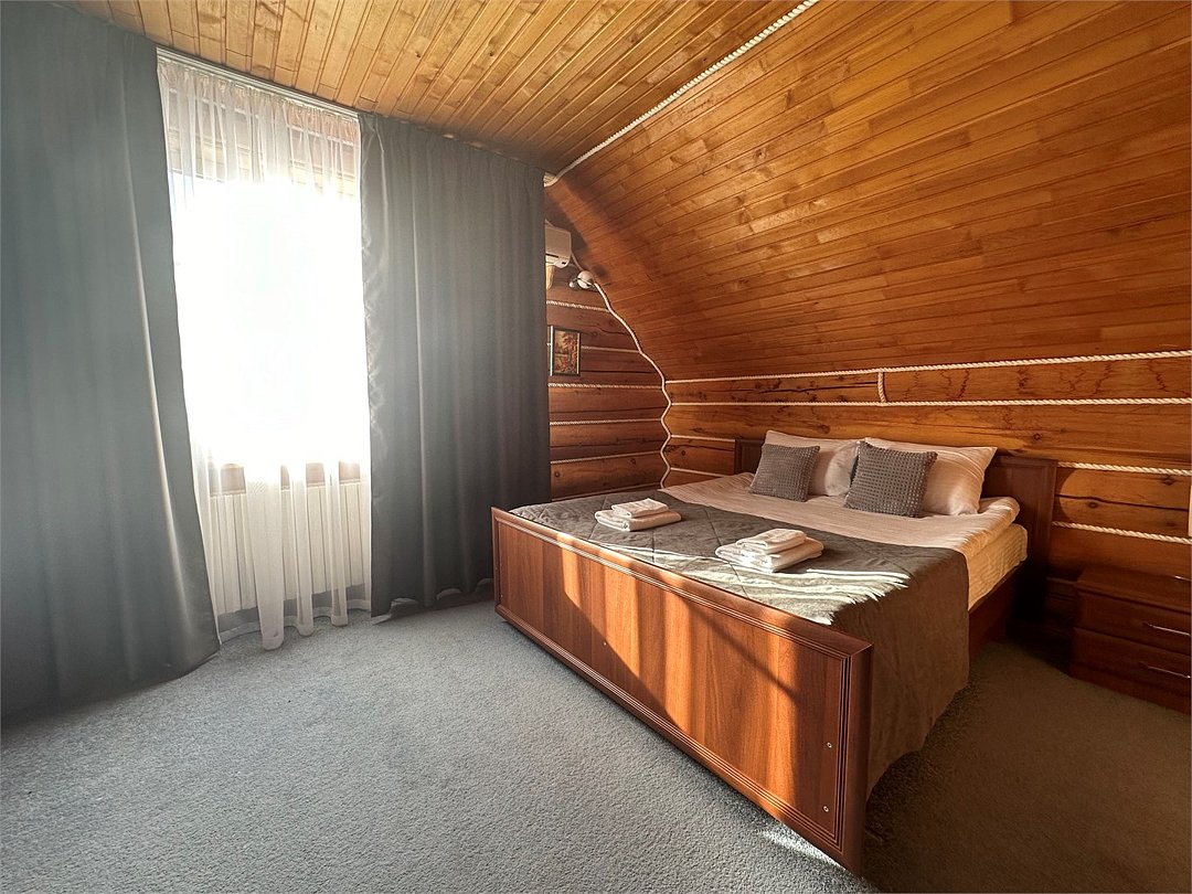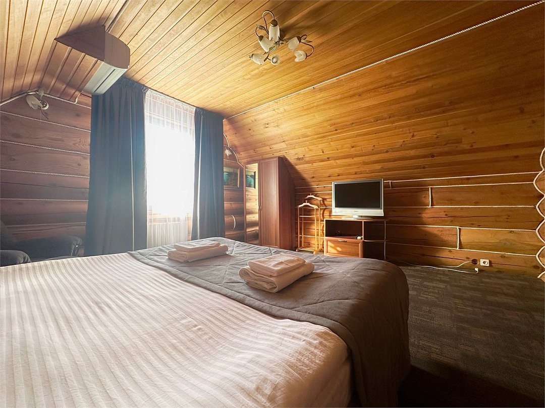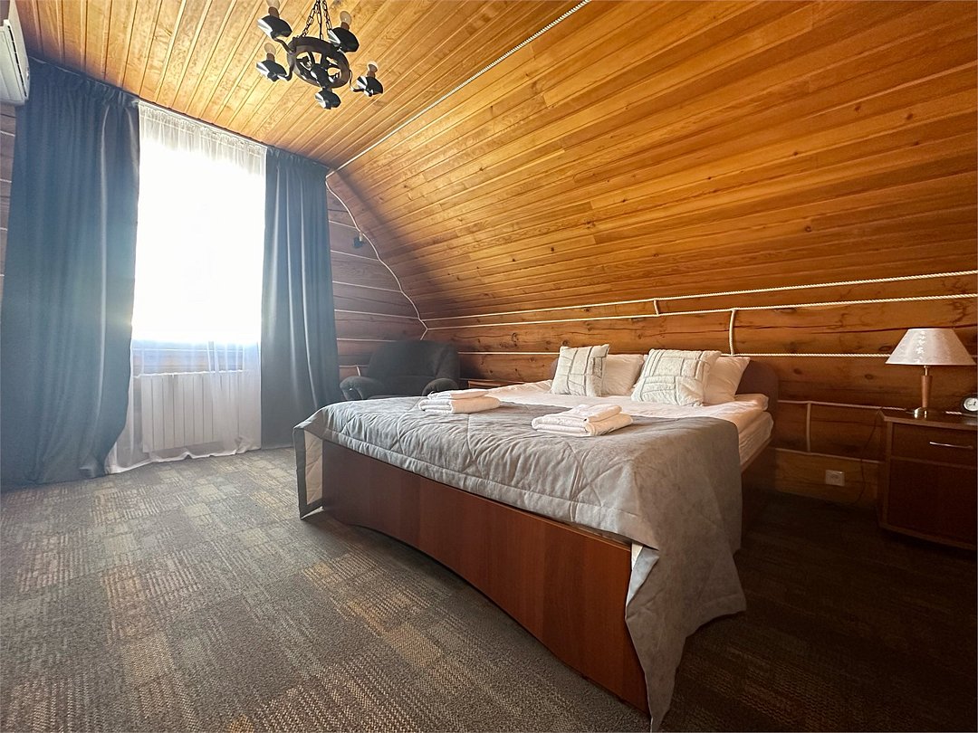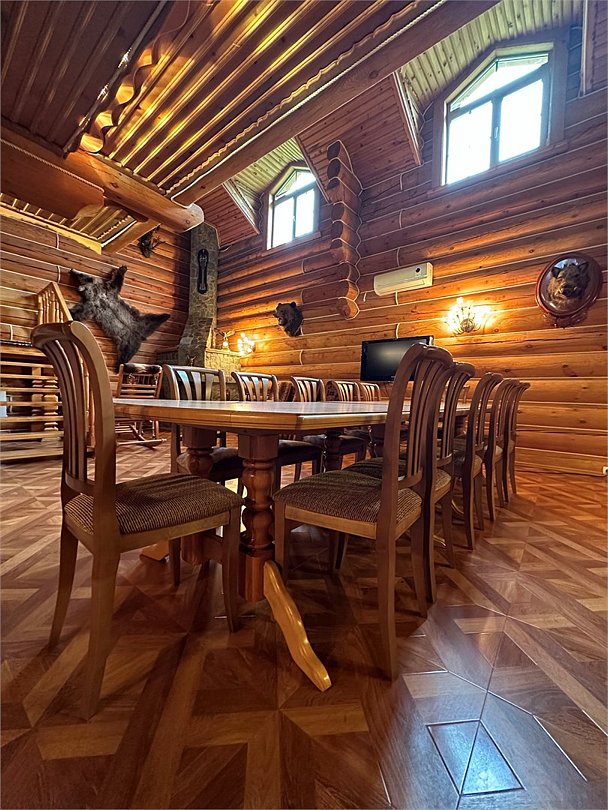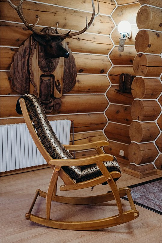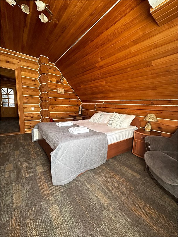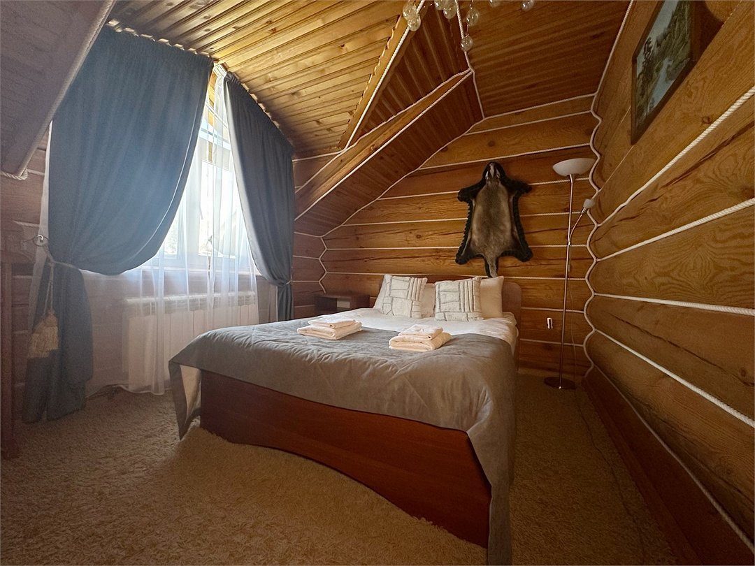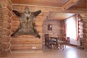 Двухэтажный коттедж «Викинг» оформлен в русском стиле, украшен шкурами диких животных, картинами, статуэтками ручной работы. Коттедж с видом на горы, лес и территорию туристического комплекса.