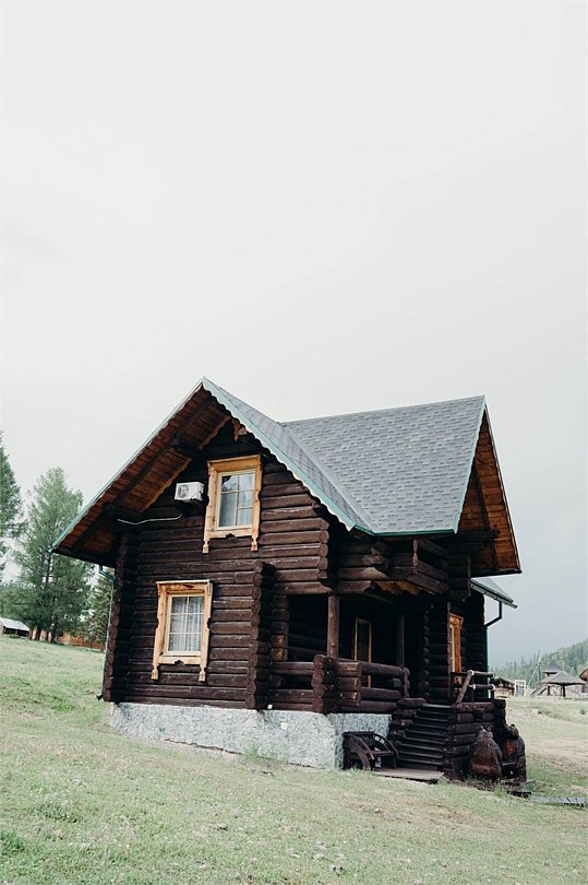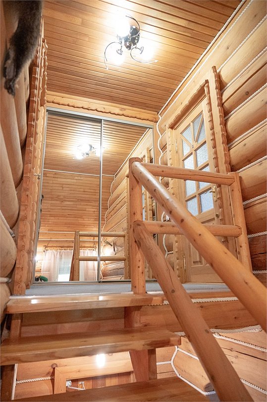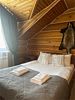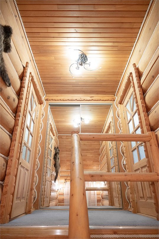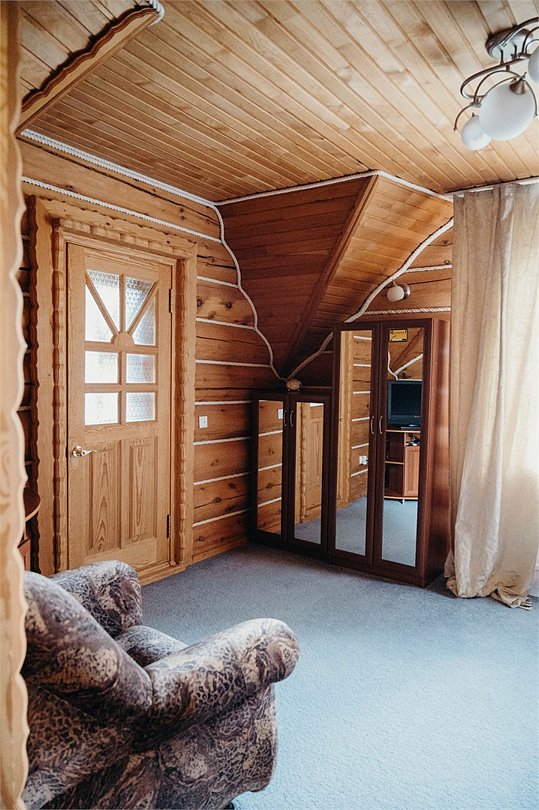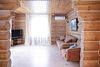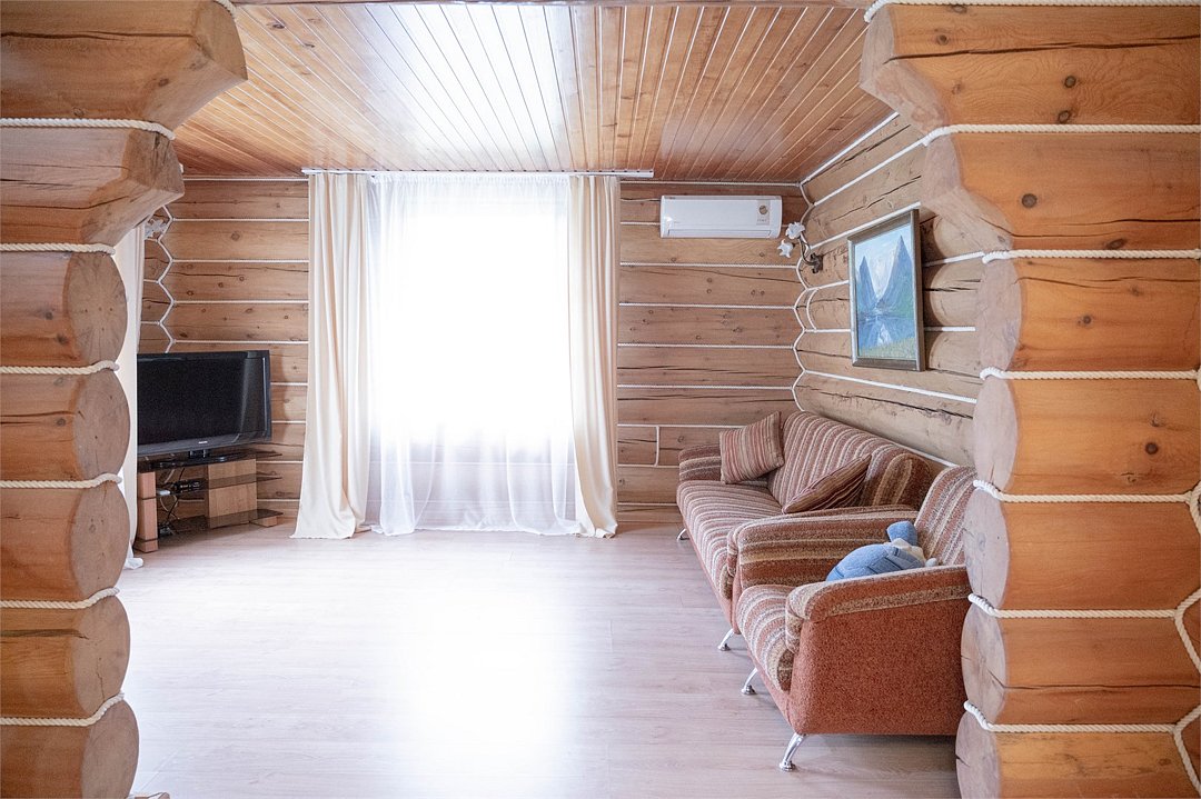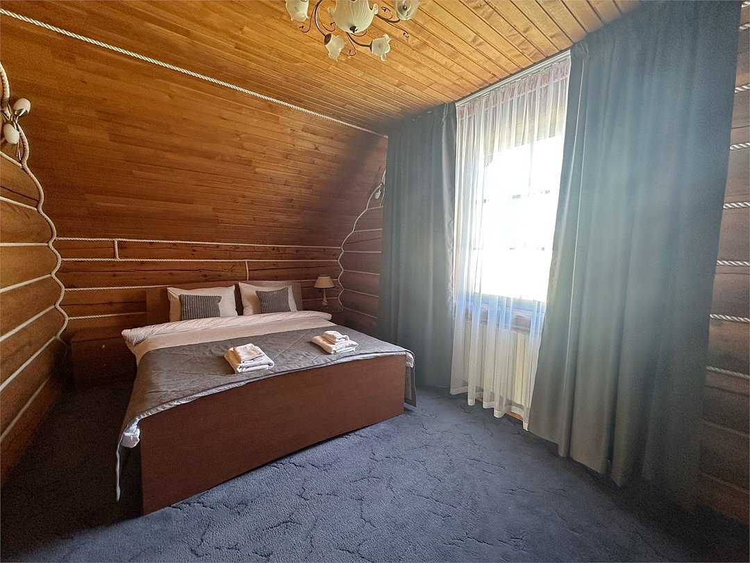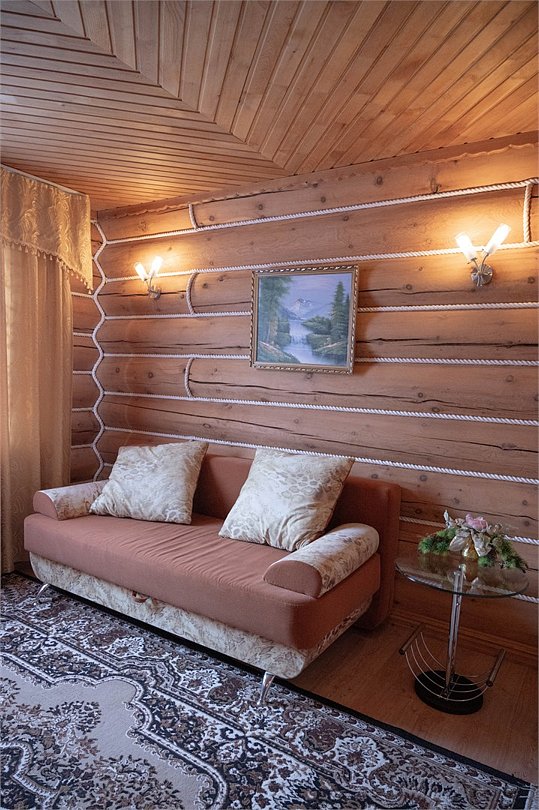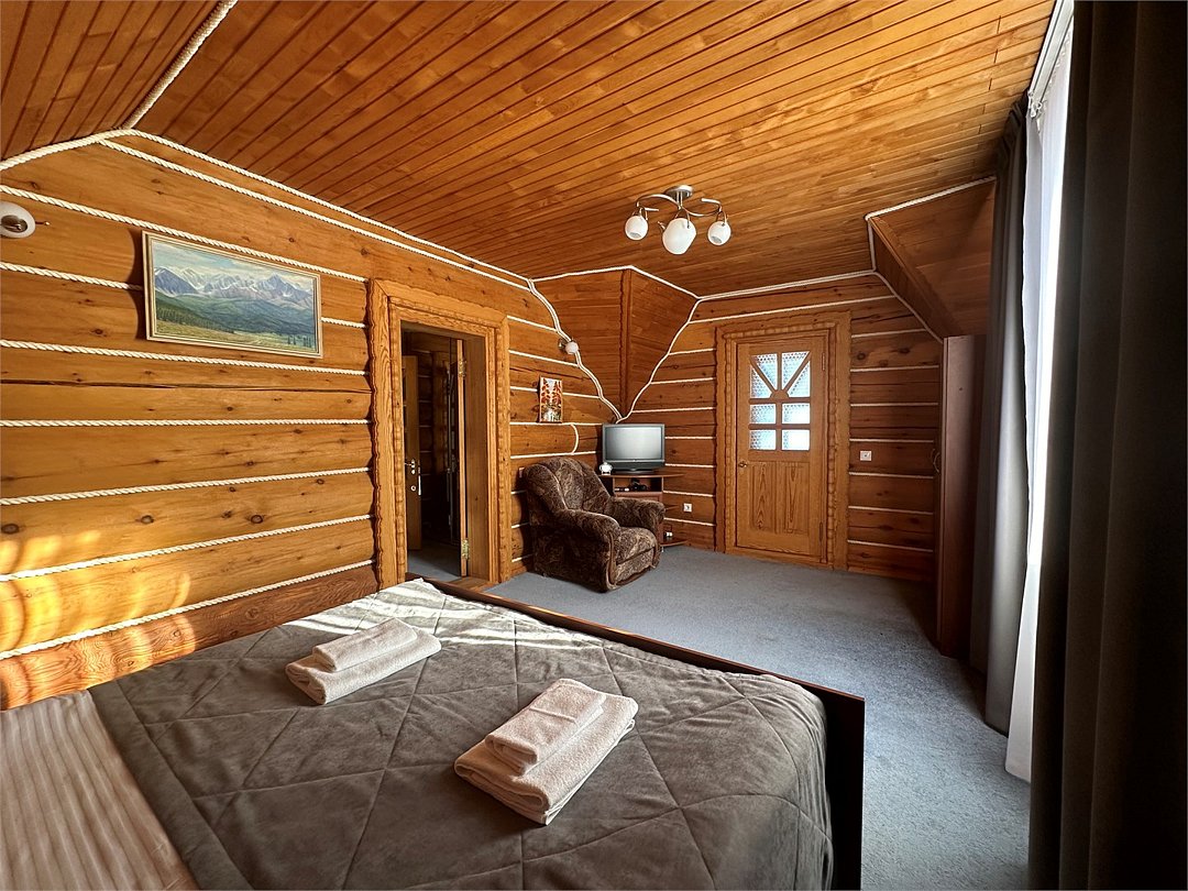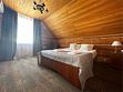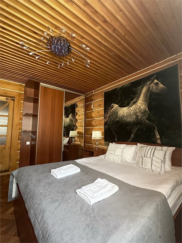 Двухэтажный коттедж «Викинг» оформлен в русском стиле, украшен шкурами диких животных, картинами, статуэтками ручной работы. Коттедж с видом на горы, лес и территорию туристического комплекса.