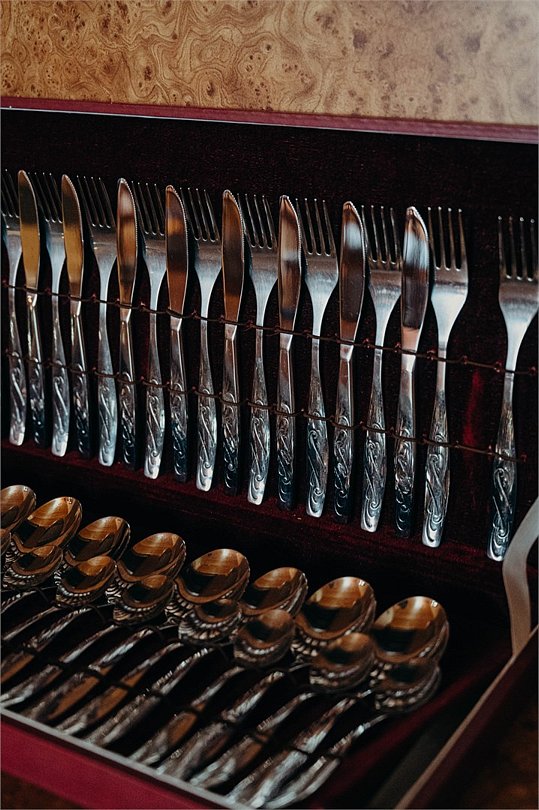 Кухонная зона: обеденный стол, стулья, кухонный гарнитур, холодильник, плита, набор посуды, мойка, вытяжка, электрический чайник, заварочный чайник, чайный сервиз, консервный нож, штопор.