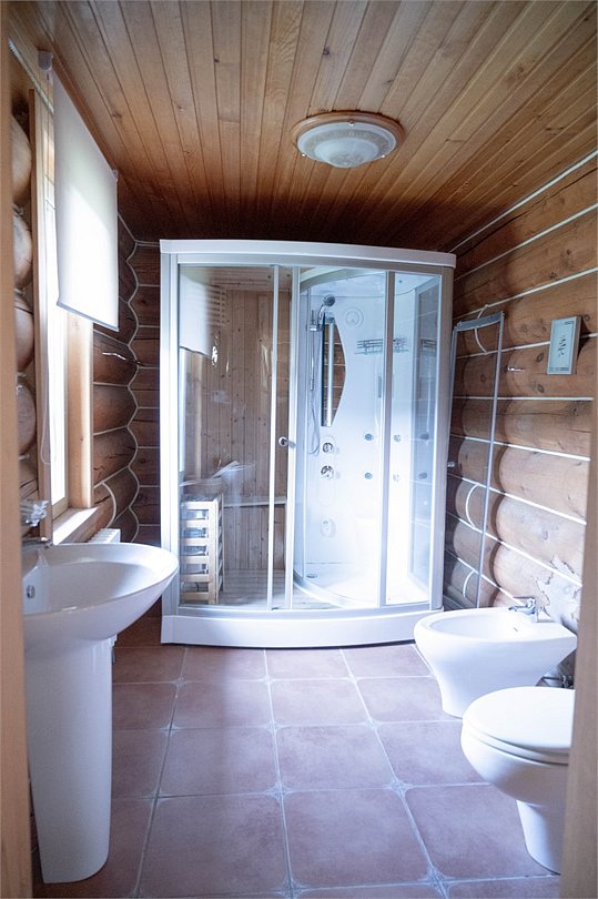 Санузел на первом этаже с умывальником, с душевой кабиной, набор полотенец, индивидуальные гигиенические наборы (мыло, шампунь, гель для душа, шапочка для душа, зубная щетка, зубная паста).