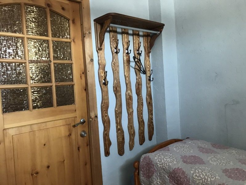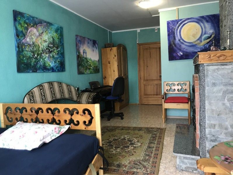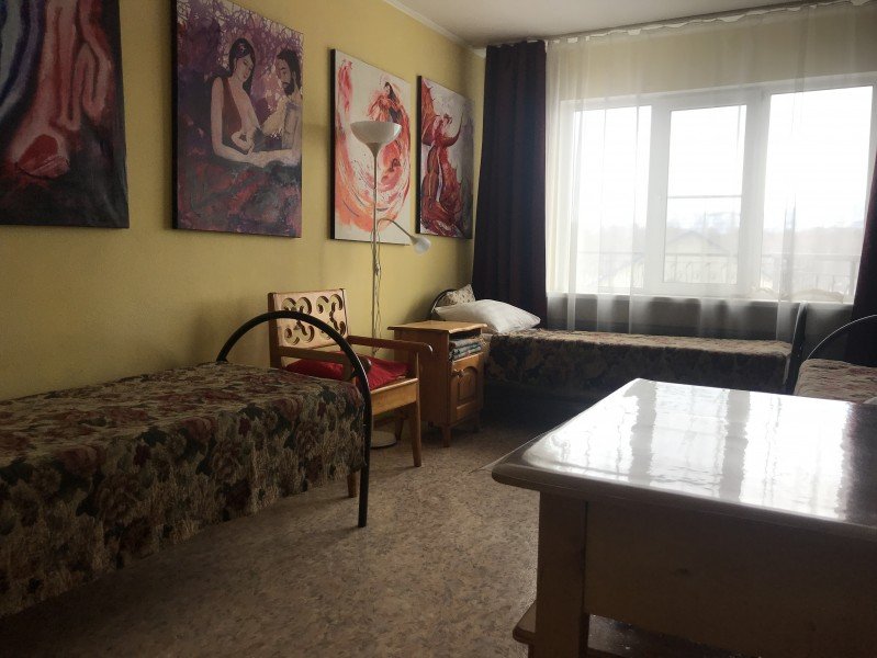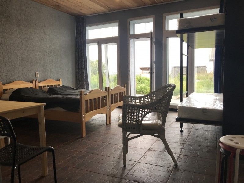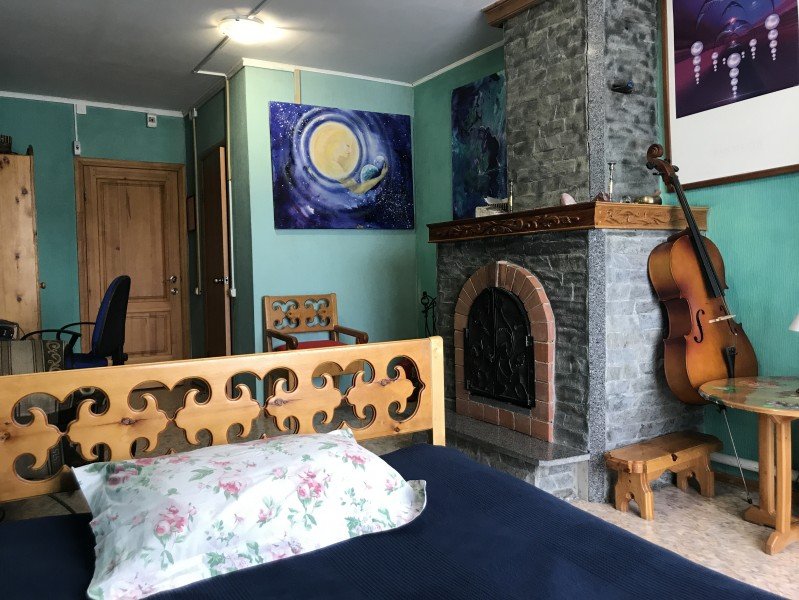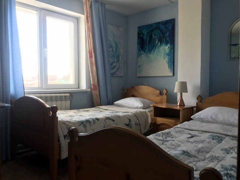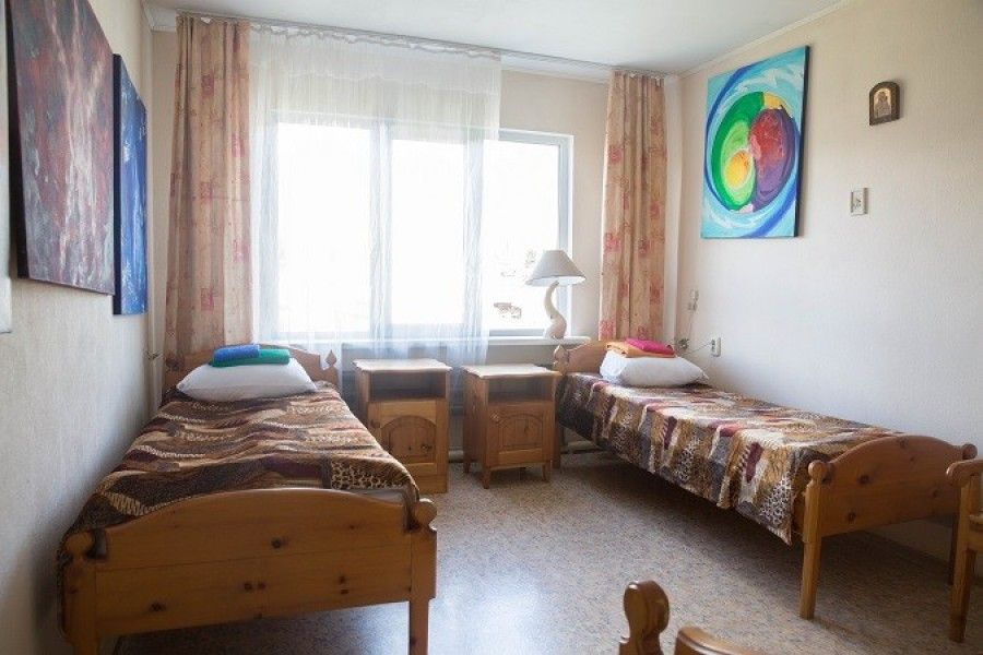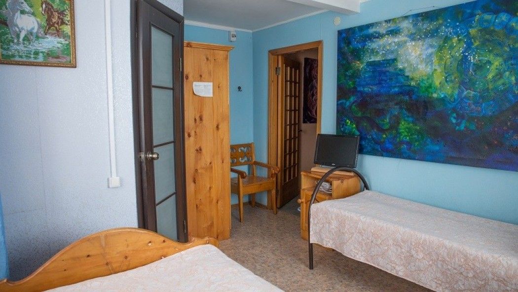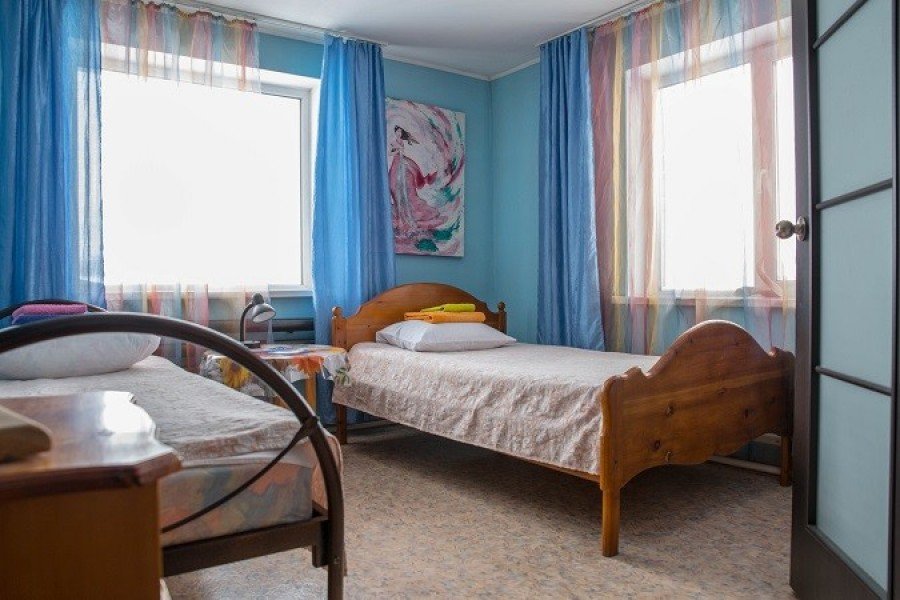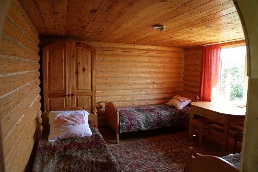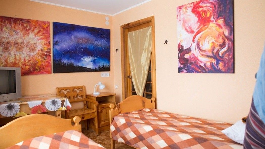 Двухместный номер расположен на первом этаже гостевого дома. В комнате две кедровые кровати, белое белье, полотенца. Тумбочка и полки для одежды, стол. Туалет, душ — на этаже. Стены украшены картинами американской художницы К. Хилтон. Можно воспользоваться общей кухней или заказать питание.