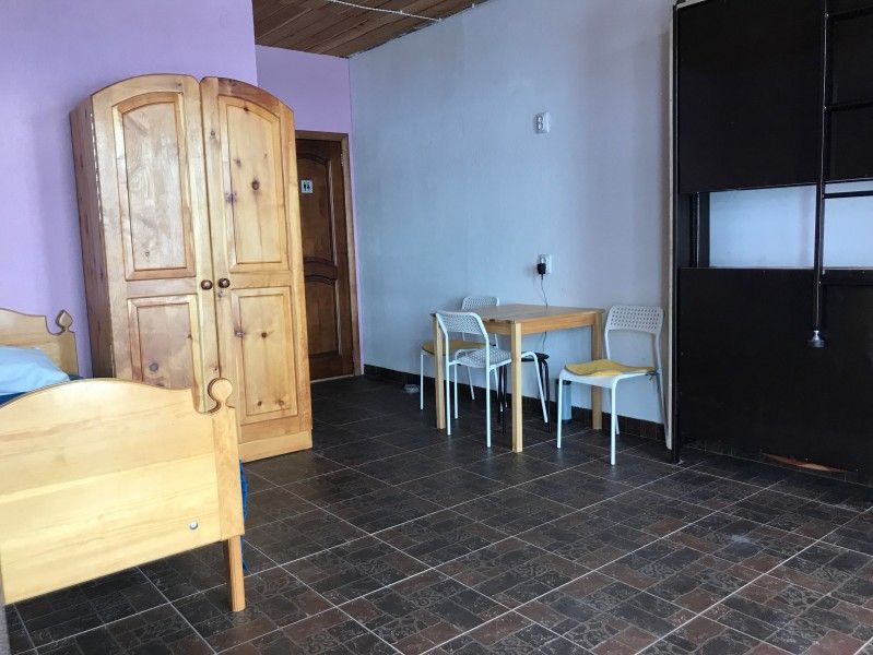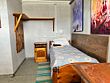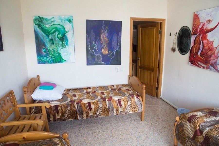 Трехместный номер класса эконом расположен на втором этаже гостевого дома. В комнате три кедровые кровати, белое белье, полотенца. Тумбочка и полки для одежды, стол. Туалет рядом с комнатой. В других комнатах на этаже есть свои туалеты. Душ на первом этаже. Стены украшены картинами американской художницы К. Хилтон. Можно воспользоваться общей кухней или заказать питание.