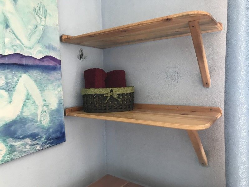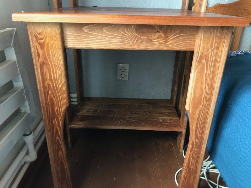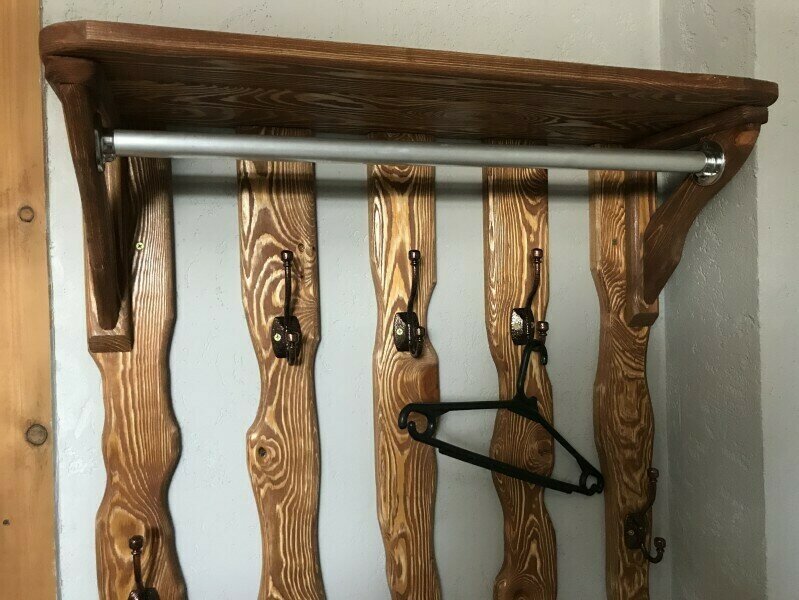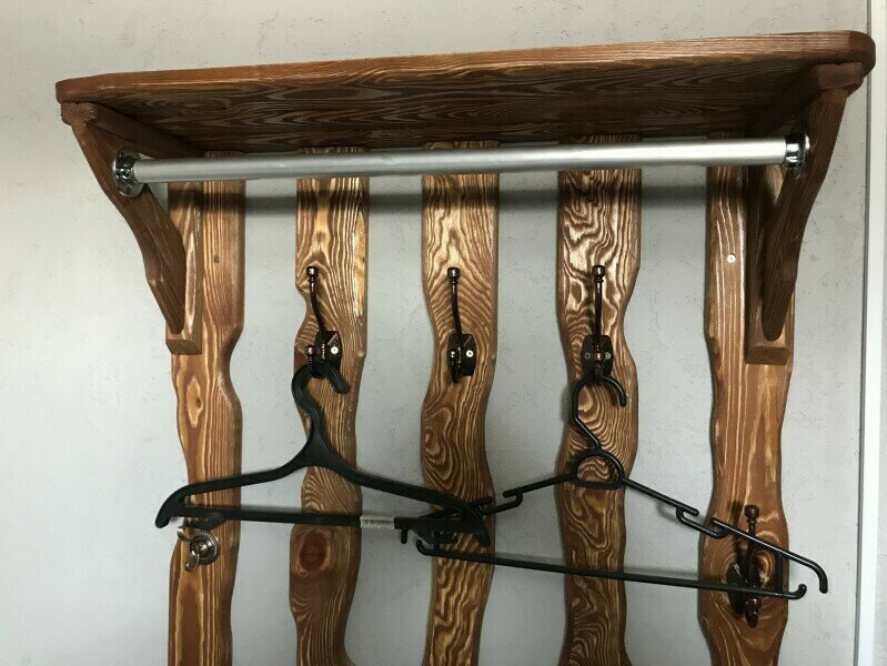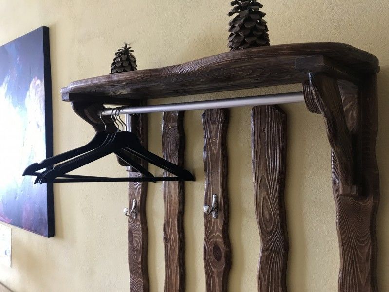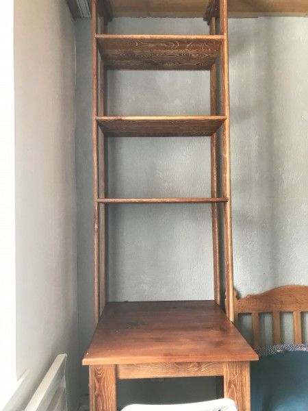 Вещи можно разместить в четыре отделения деревянных полок из массива брашированной сосны. Имеется стол 70х80 см.