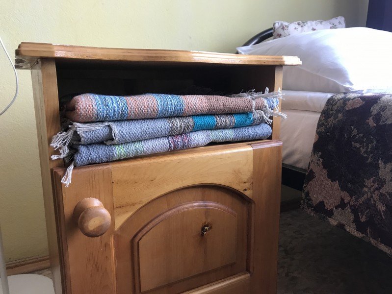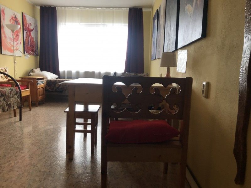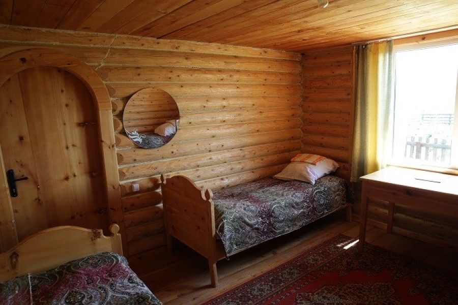 Усть-Кокса. Трехместный номер класса эконом расположен на втором этаже гостевого дома. В комнате три кедровые кровати, белое белье, полотенца. Тумбочка и полки для одежды, стол. Туалет рядом с комнатой. В других комнатах на этаже есть свои туалеты. Душ на первом этаже. Стены украшены картинами американской художницы К. Хилтон. Можно воспользоваться общей кухней или заказать питание.