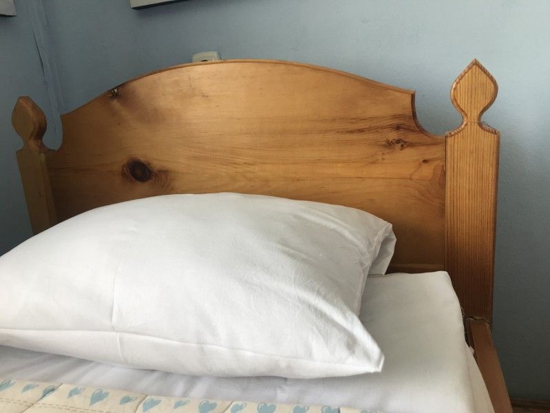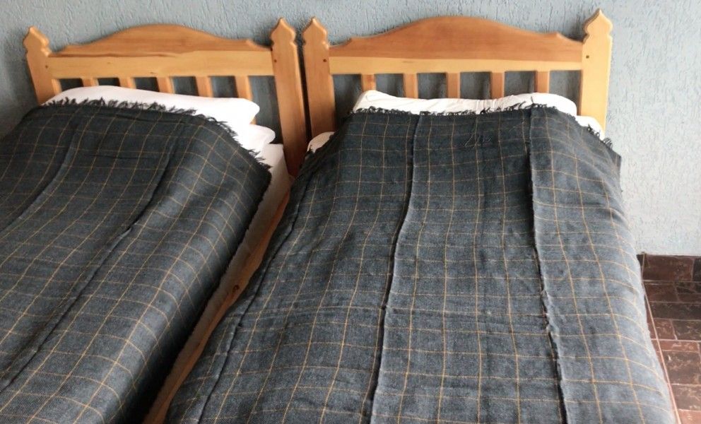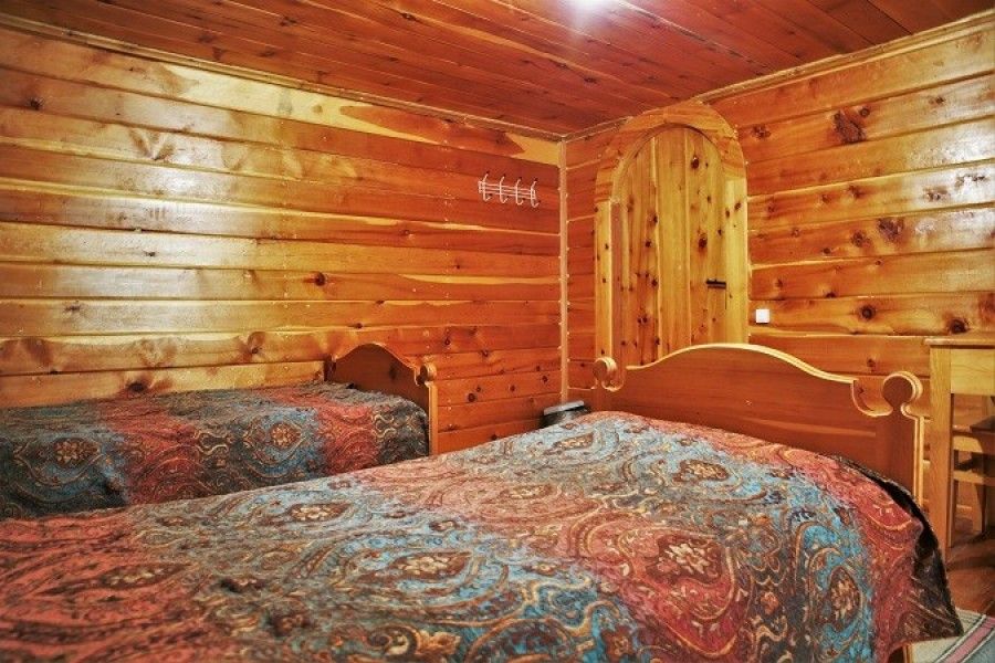 В номере имеется две односпальные кедровые кровати с декоративными спинками, которые могут быть соединены в одну двуспальную кровать.