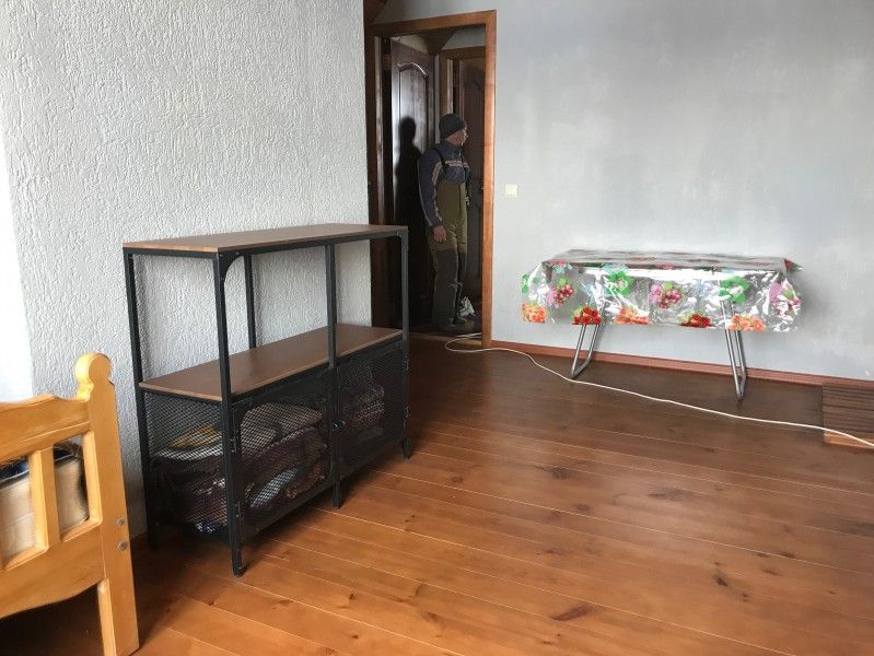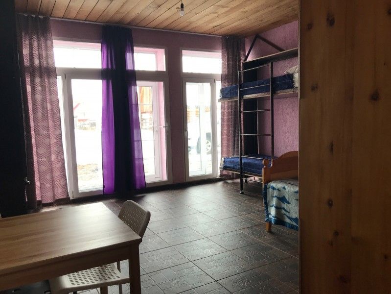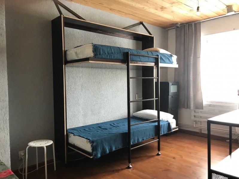 Деревянный пол из соснового массива. Имеются две кедровые односпальные кровати, которые можно соединить в одну двуспальную кровать. Одна двухъярусная кровать - трансформер на два односпальных места.
