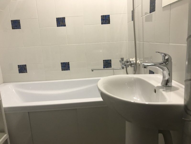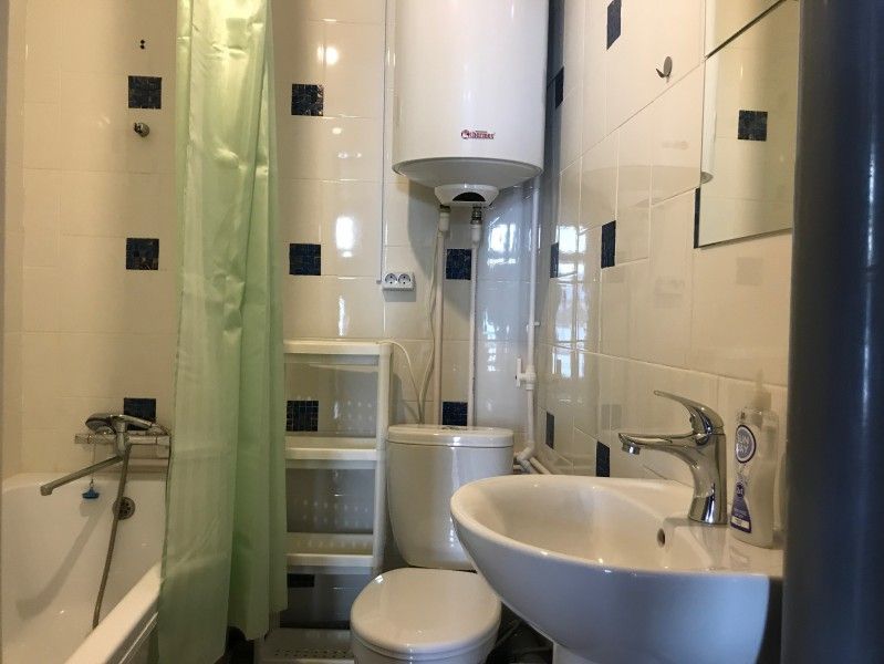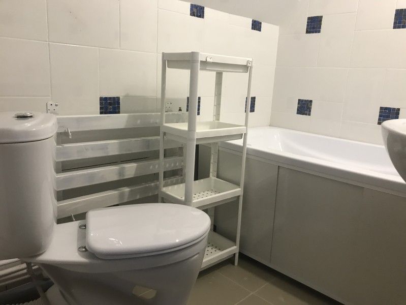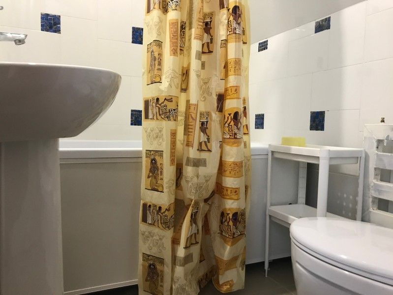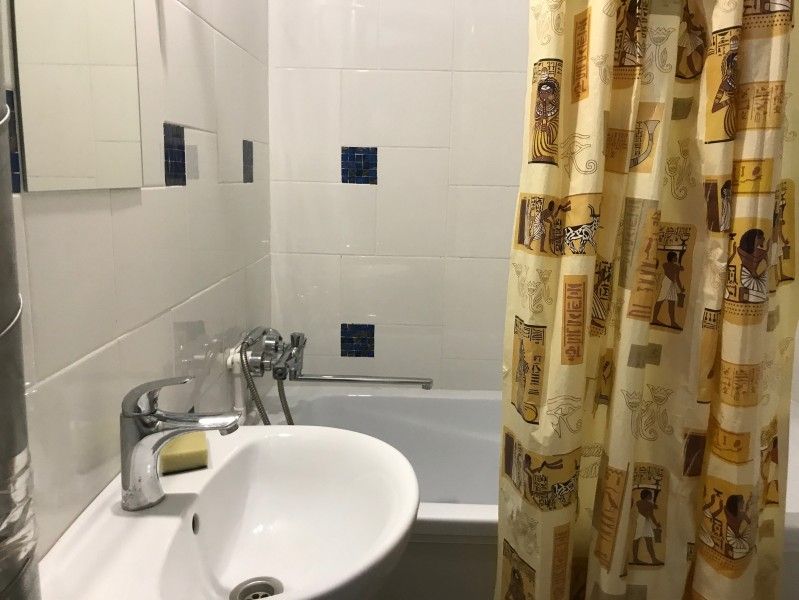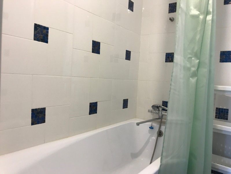 Комната оборудована просторным санузлом с ванной 170 см, раковиной и унитазом. Санузел отделан кафельной плиткой.