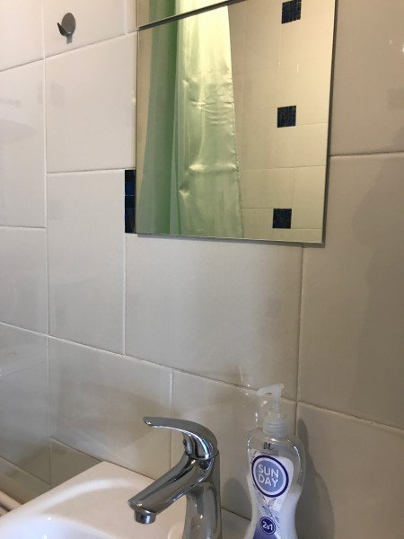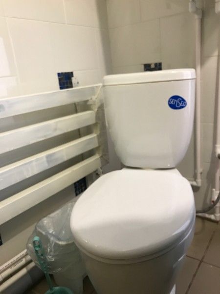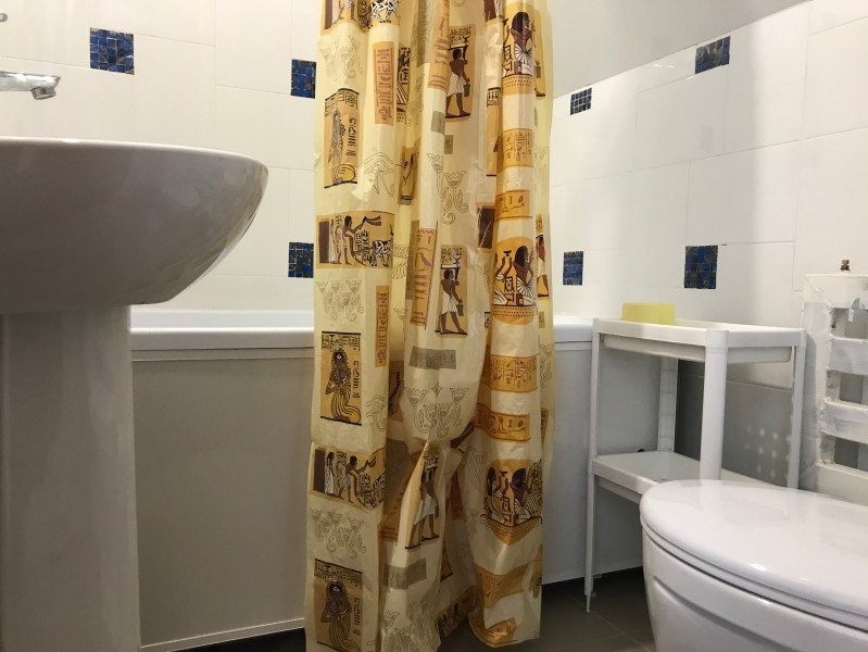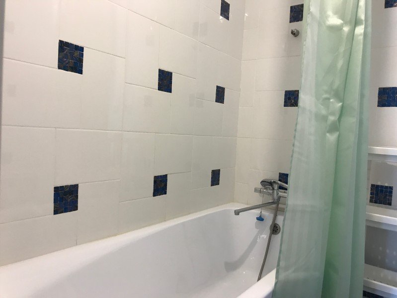 В номере ванна, раковина и унитаз. Санузел отделан кафельной плиткой.