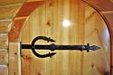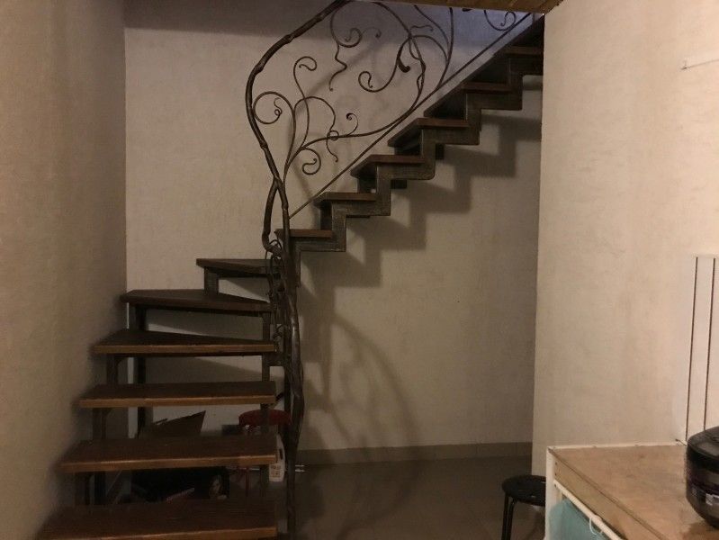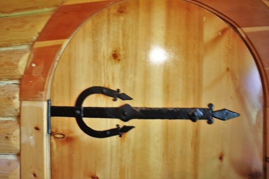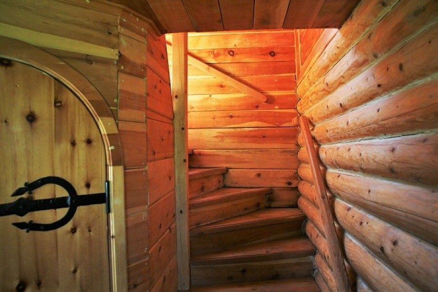 Комната находится на втором этаже. К ней ведет художественная лестница с четырьмя зарубежными ступенями из брашированной сосны и кованными фактурными перилами в виде виноградной лозы.