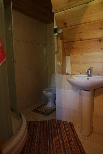 Трехместный экономный номер расположен на втором этаже кедрового дома. В комнате три кедровые односпальные кровати, белое белье, полотенца. Стол, шкаф для одежды. На этаже туалет, душевая кабина. Кухня и баня недалеко от кедрового дома. Во дворе также уличные туалеты, раковины.