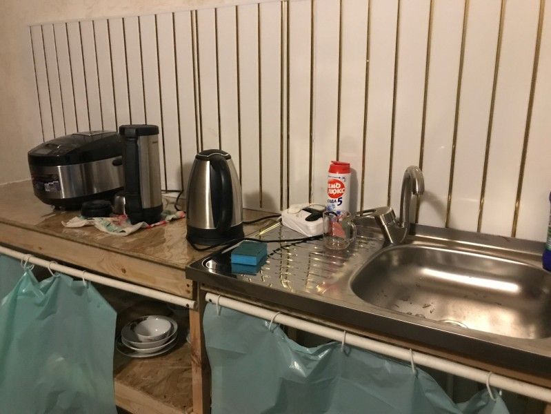 На первом этаже имеется мини кухня с раковиной, горячей водой и мультиваркой.